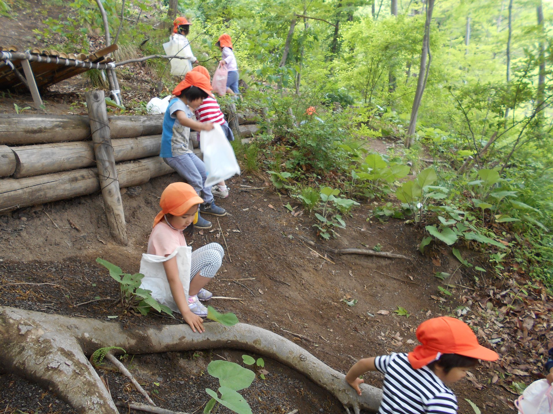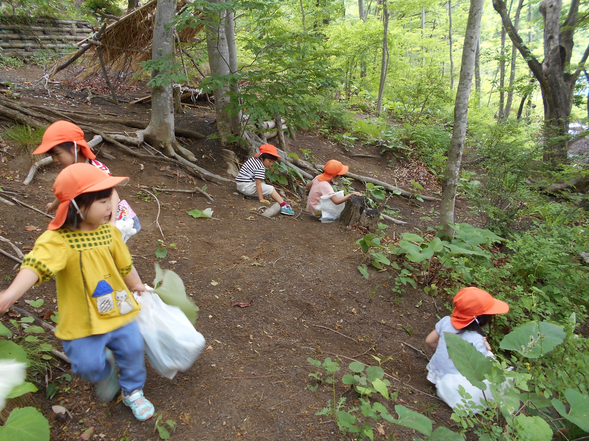 色水あそびの材料集めに裏山に登りました。子ども達は意欲的に葉っぱを探しながら山遊びも楽しんでいます。怖い時はお尻で滑ることも子ども達が考えた行動です。