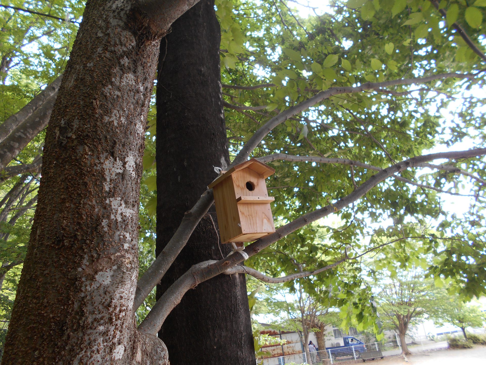 おじいちゃん先生が取り付けてくれた「巣箱」初めて1羽飛び立った!!何の小鳥かな?みんなでしばらく待ったけど発見できず残念!!身近に小鳥と共存できる素晴らしい環境のこども園です。