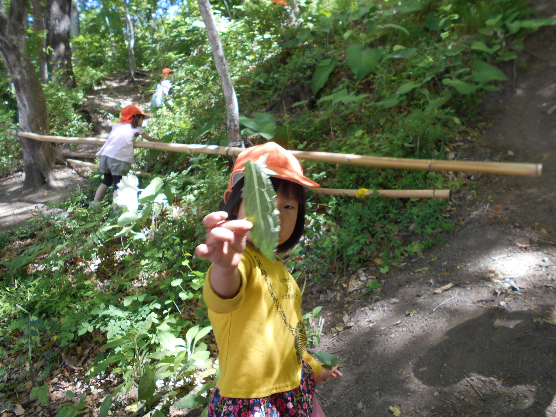 「ギザギザの葉っぱだよ。」と見せてくれる女の子