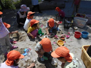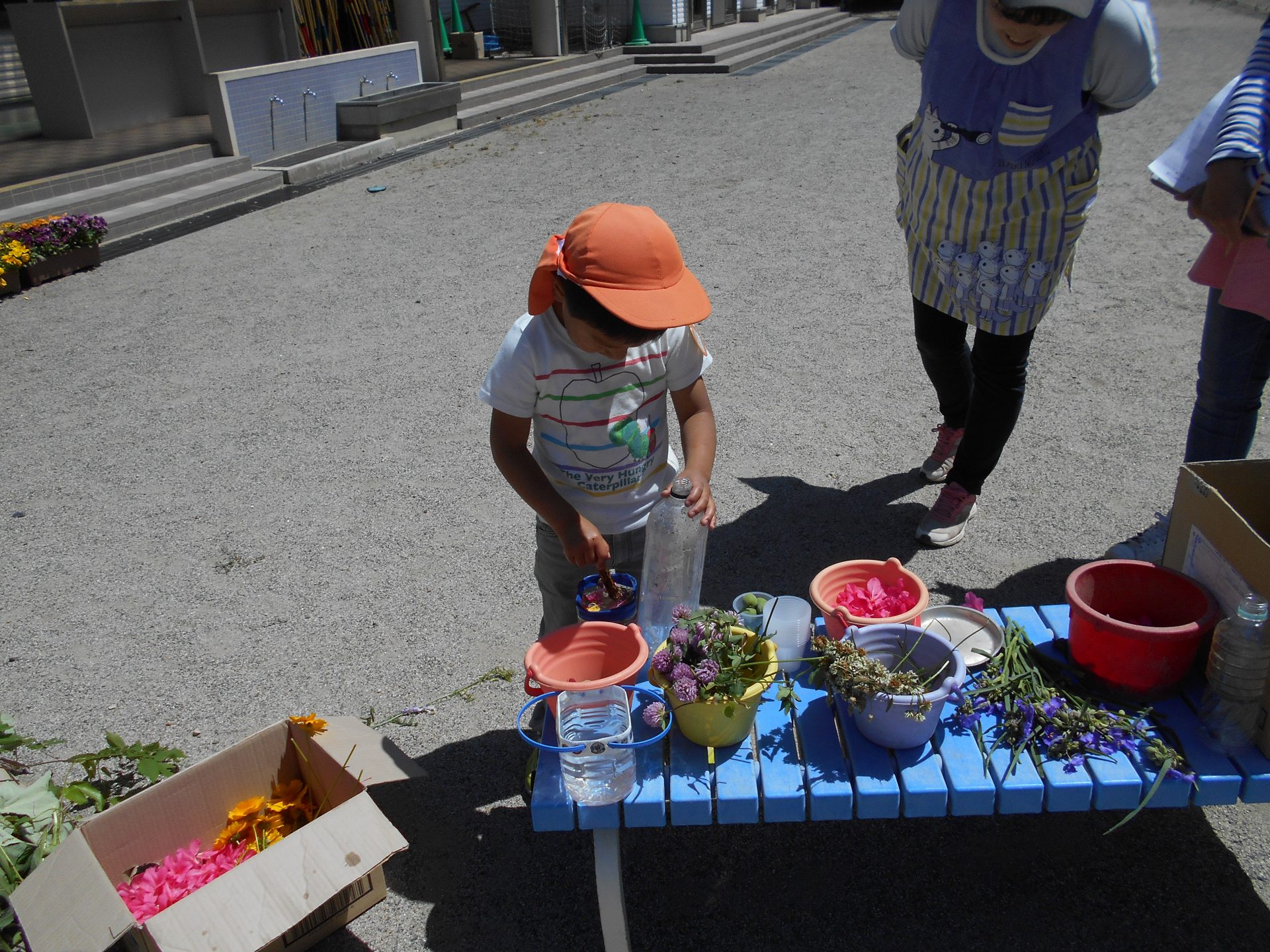 園にある花で色水あそびです。自然とペットボトルに差して飾る姿が見られます。