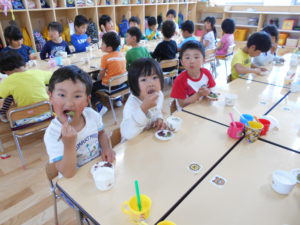 よもぎ摘みを経験した事で、その後も外遊びやお散歩の際に、よもぎを見つける姿も見られました。また、「おうちで作ってもらうから作り方教えて。」と事務室へ来る子もいました。身近なものが食べられるという事に気付いたようです。今後は、自分たちで植えた野菜を育てながら、さらに食への関心を深めていきたいと思います。
