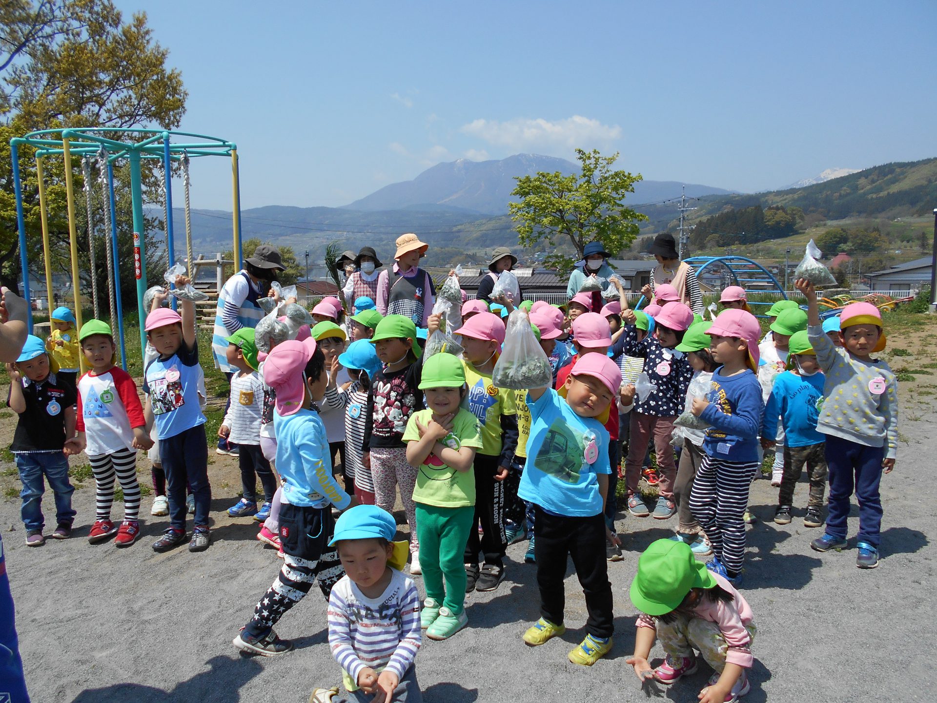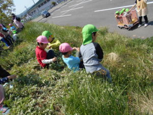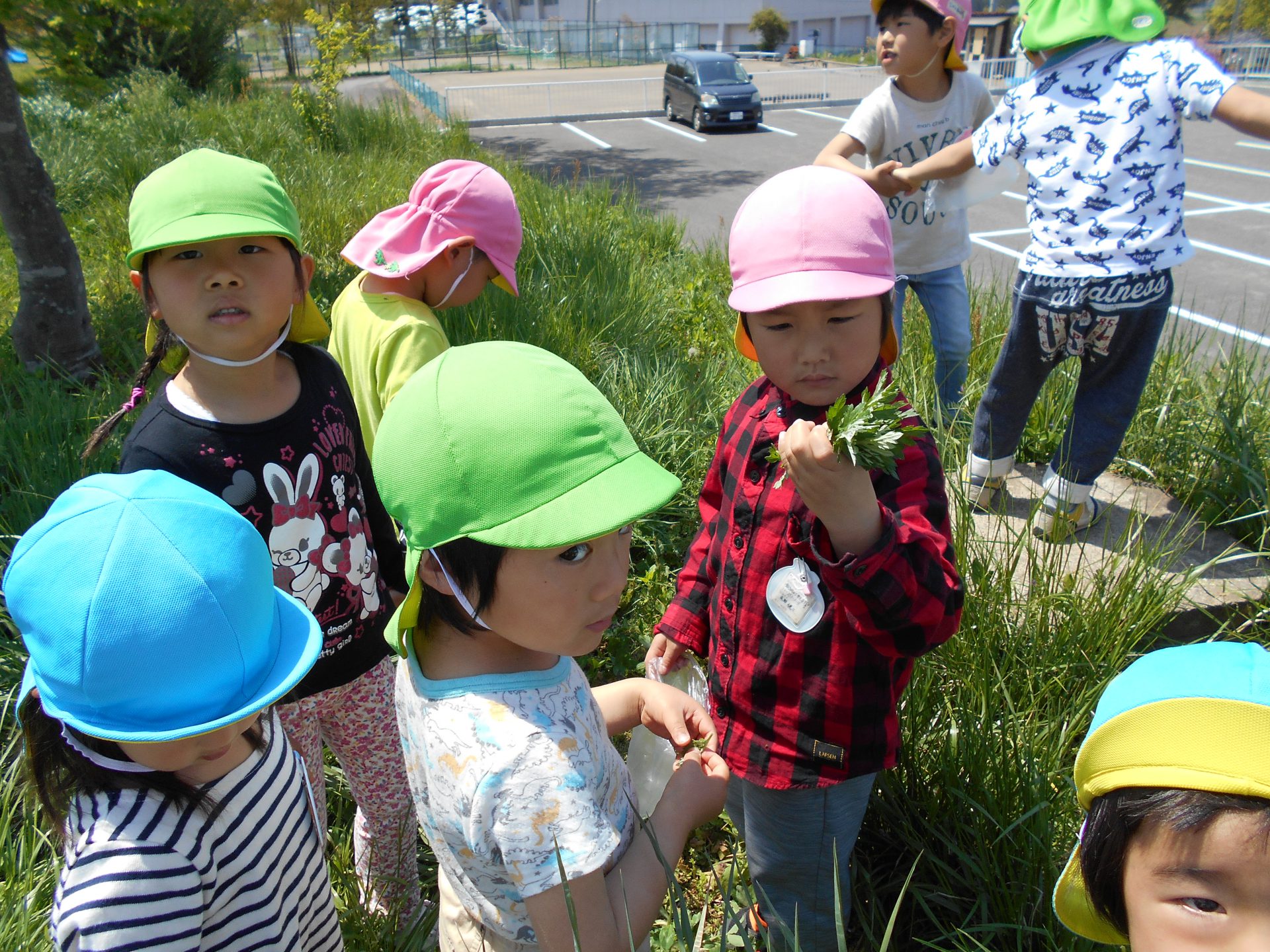 よもぎ摘みの際、年長さんが声をかけて3人で一緒に移動しながらよもぎを摘む姿が見られ、異年齢での活動を通して、年長者の自覚が出てきたのではないかと思います。