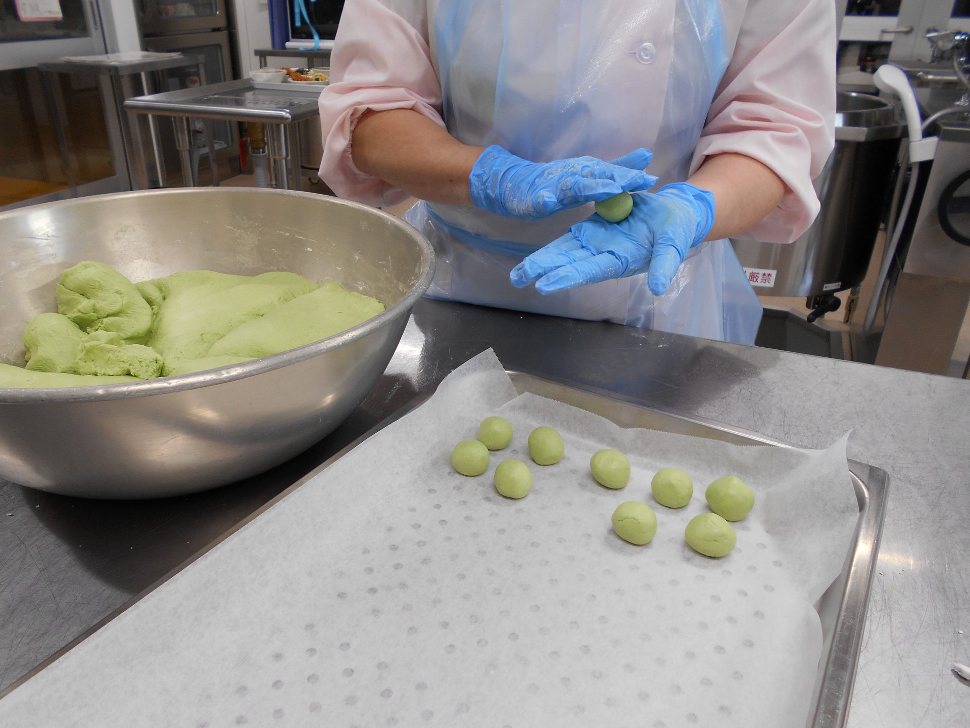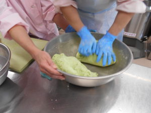 よもぎ団子のおやつの日、給食室では・・・茹でて細かくしたよもぎを、団子粉に混ぜていきます。