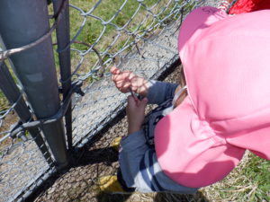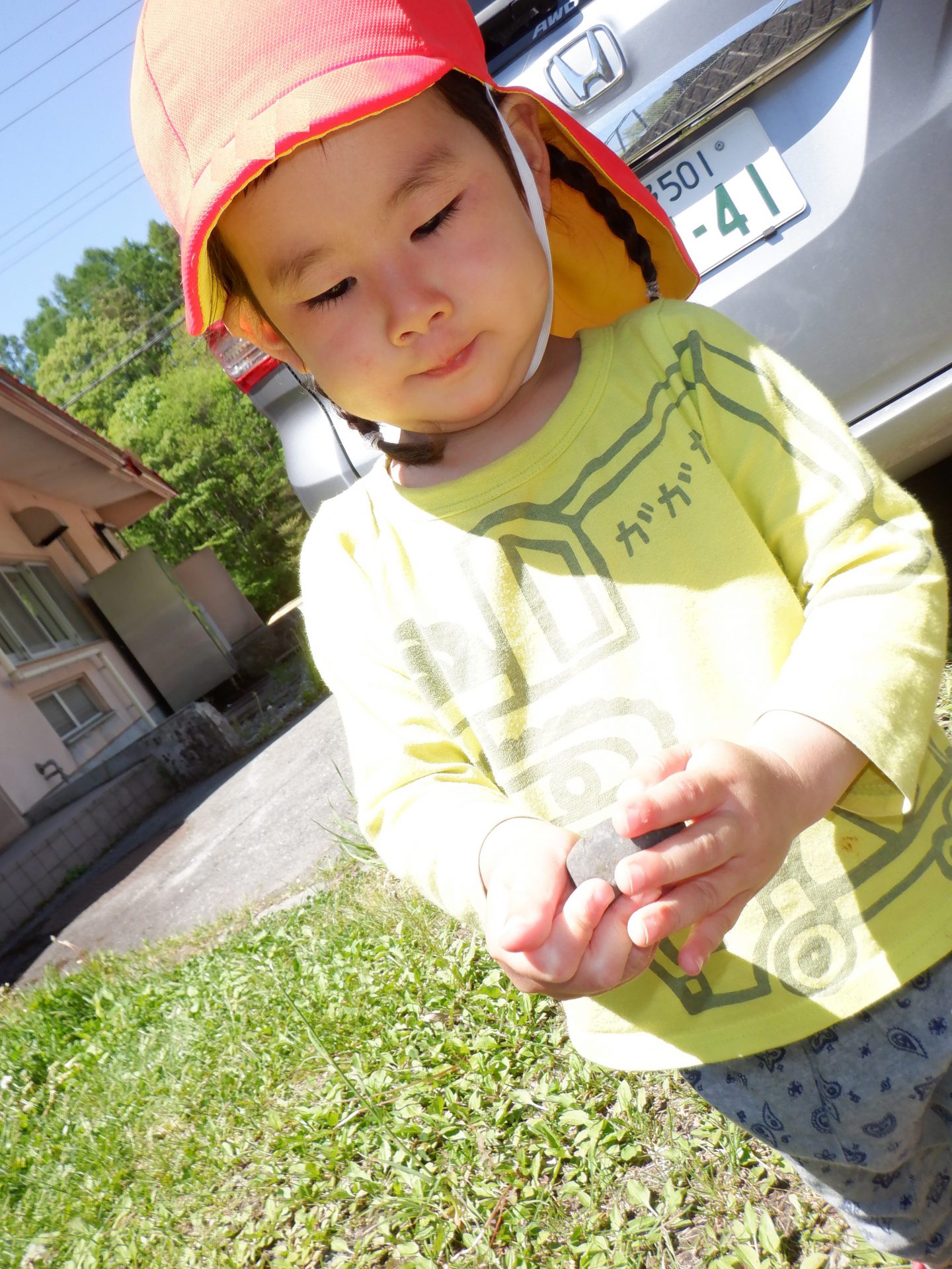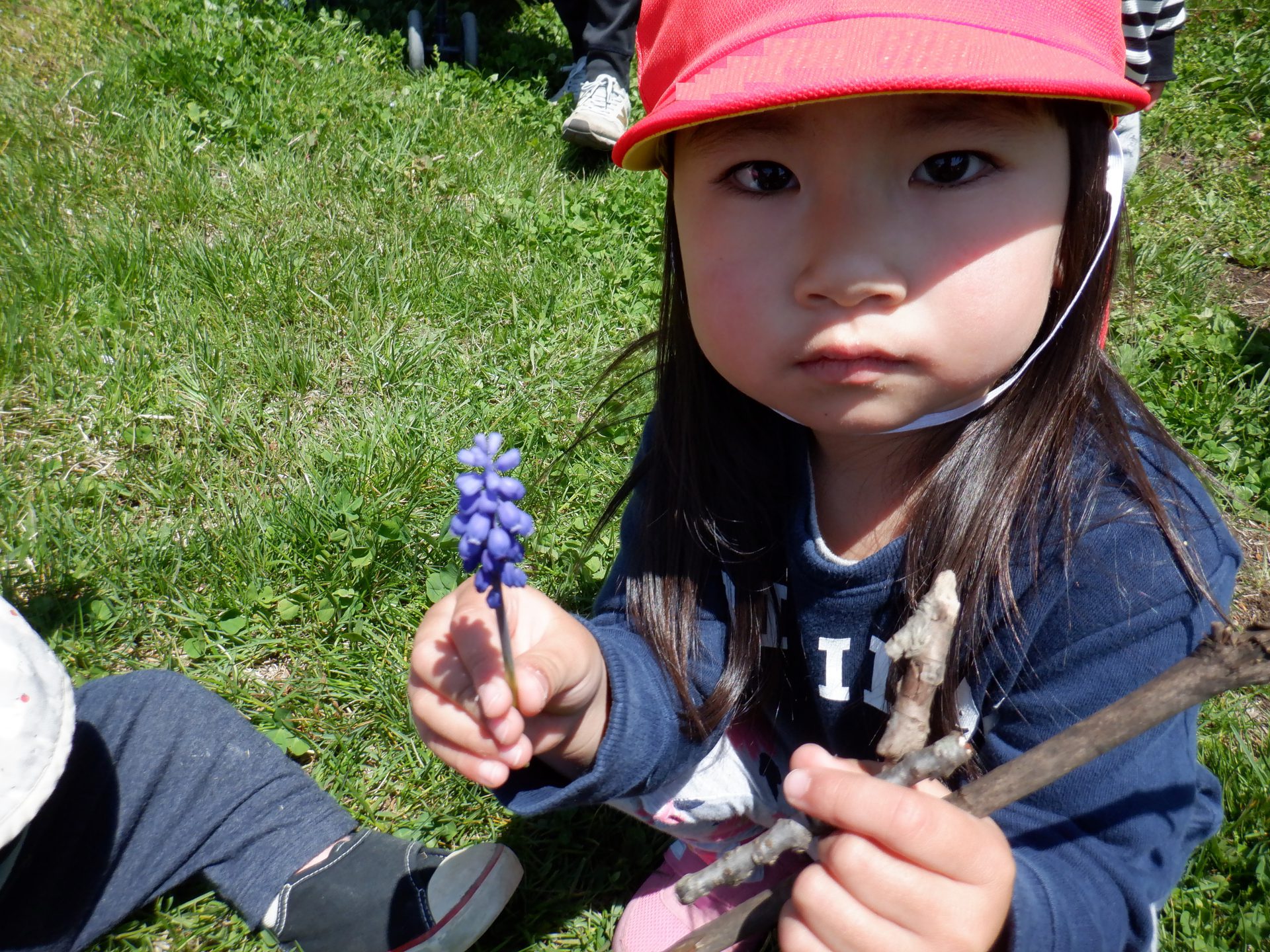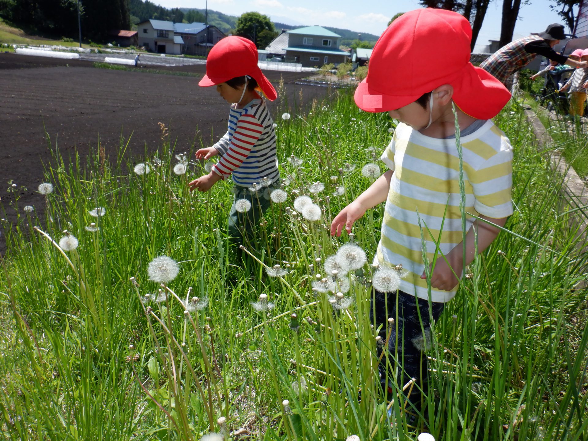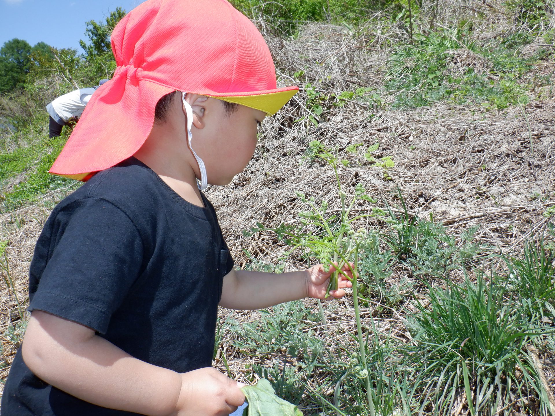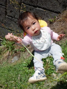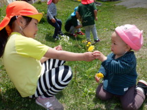 タンポポを摘んでいた0歳児さん。