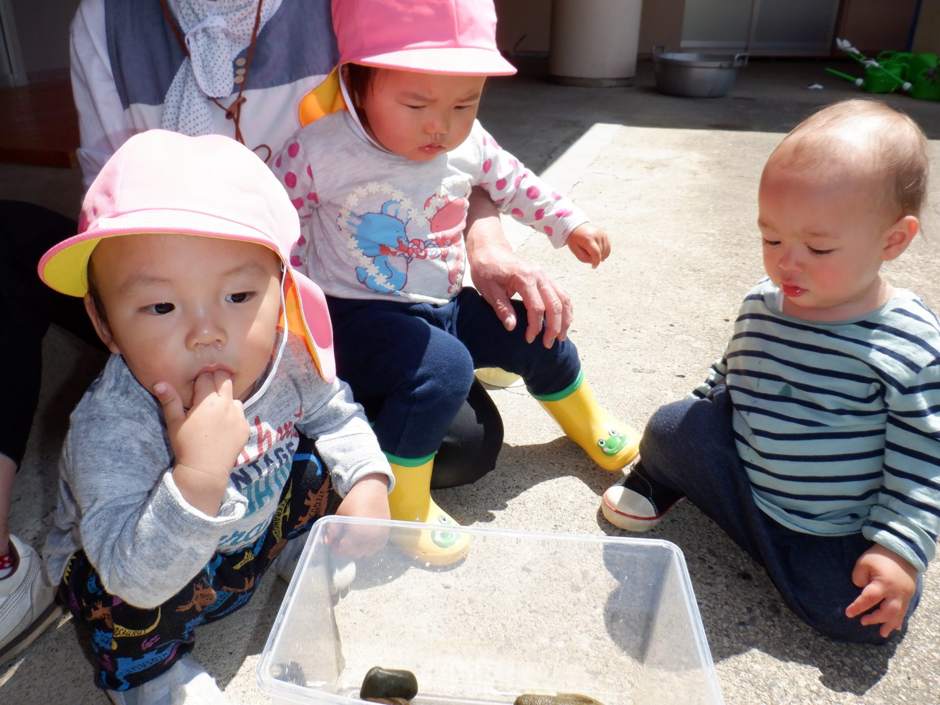 この日は、テラスで3・4歳児さんが生き物のお家(水槽)をお掃除中。