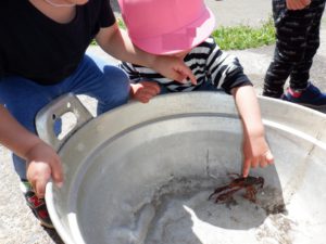 お兄さんに教えてもらい、ザリガニに触ることができました!