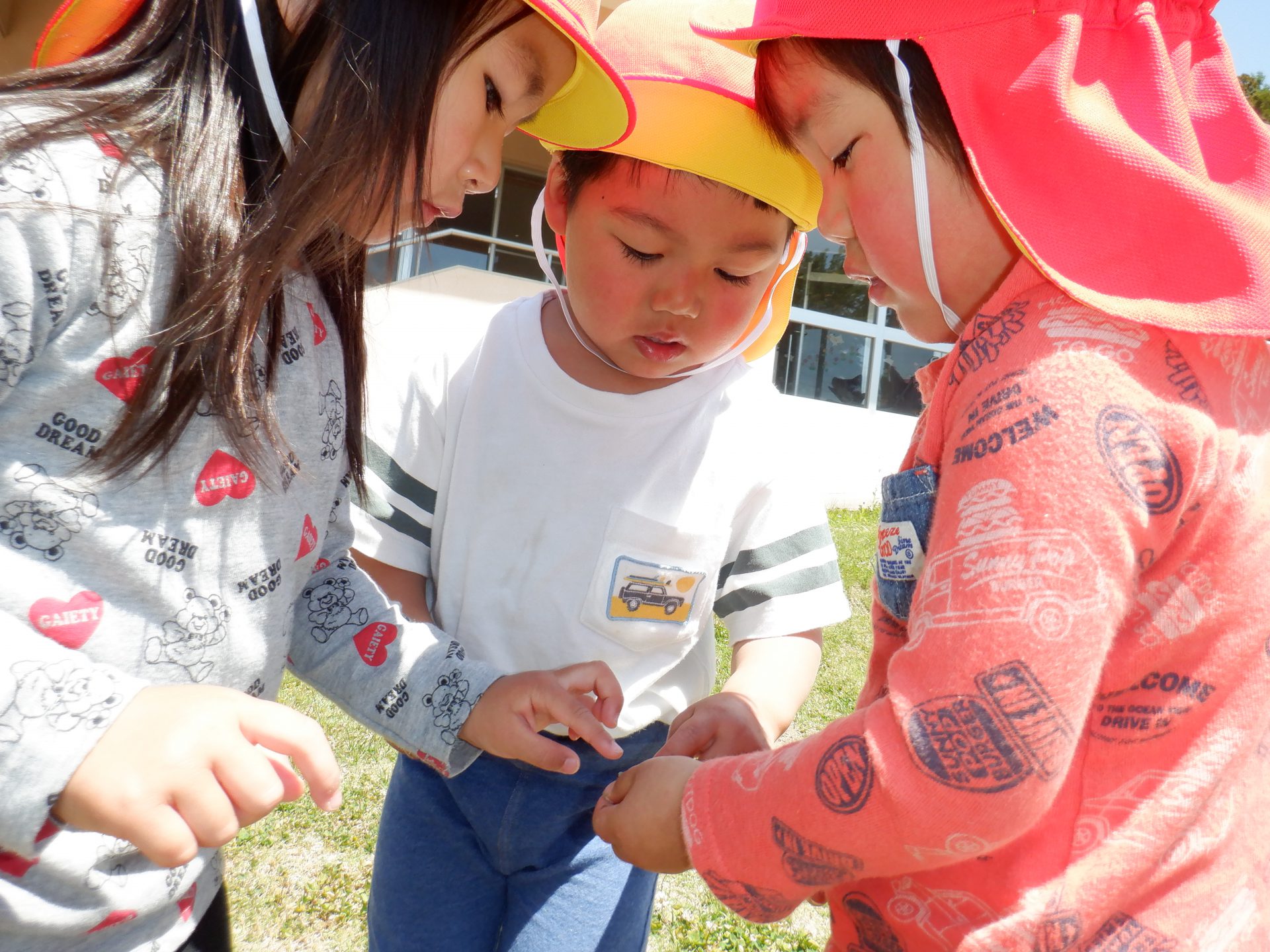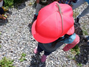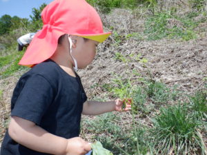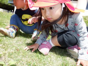 こちらでは、小さな尺取虫を発見。(写真では分かりにくいですが、子ども達の視線の先に!)