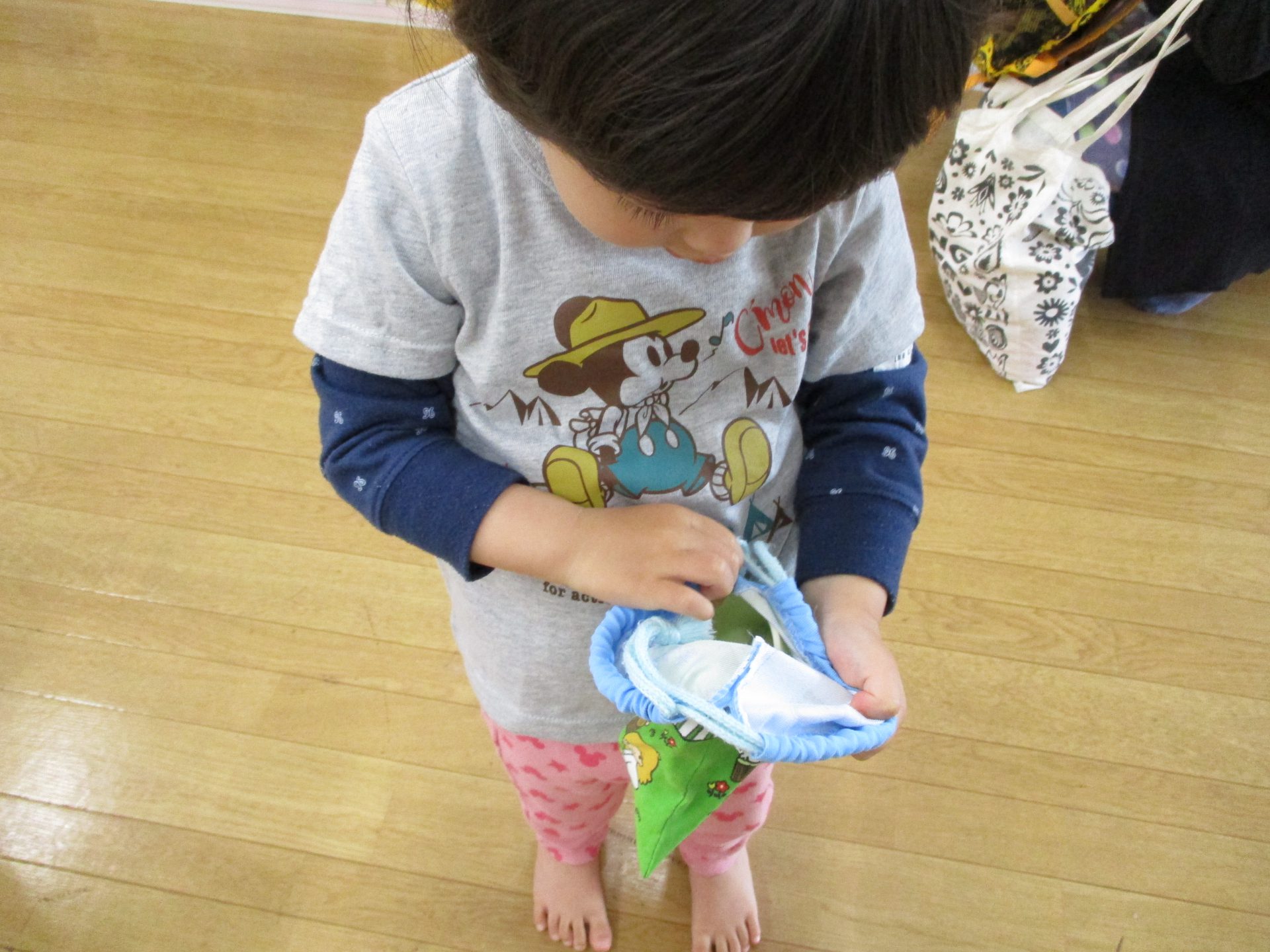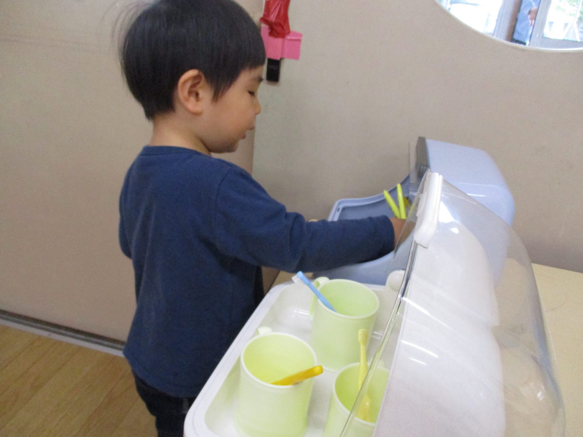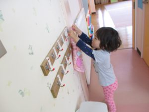 トイレのタオルを掛けたり、水筒やお手拭きタオル、歯ブラシ・コップを所定の場所に入れたり、靴下を脱いだりします。