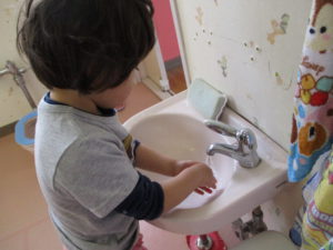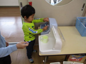 「お外行く〜!」なんて声が聞こえてお片づけを始めます。みんなで協力してお片づけを済ませると今度はトイレに向かいます。