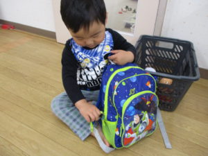 朝、大好きなお家の方と笑顔で登園!自分のリュックを背負って元気に「おはよう!」の挨拶。