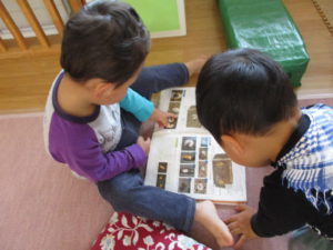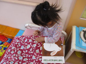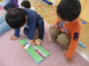 お気に入りの絵本をお友達と一緒に見たり、外に出ているお兄ちゃんお姉ちゃんの姿をじっと見つめる姿もあったり。