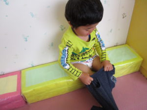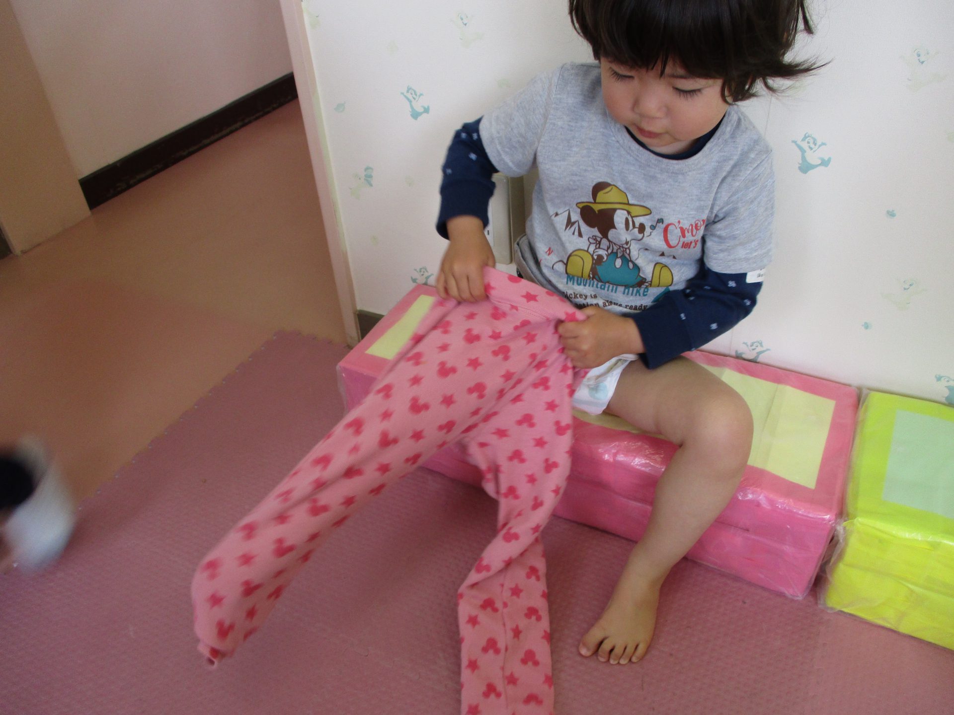 自分で椅子に座って脱いだりはいたりを上手にします。できない時には保育士の力を借りながらも、自分で最後までやろうと頑張っています。