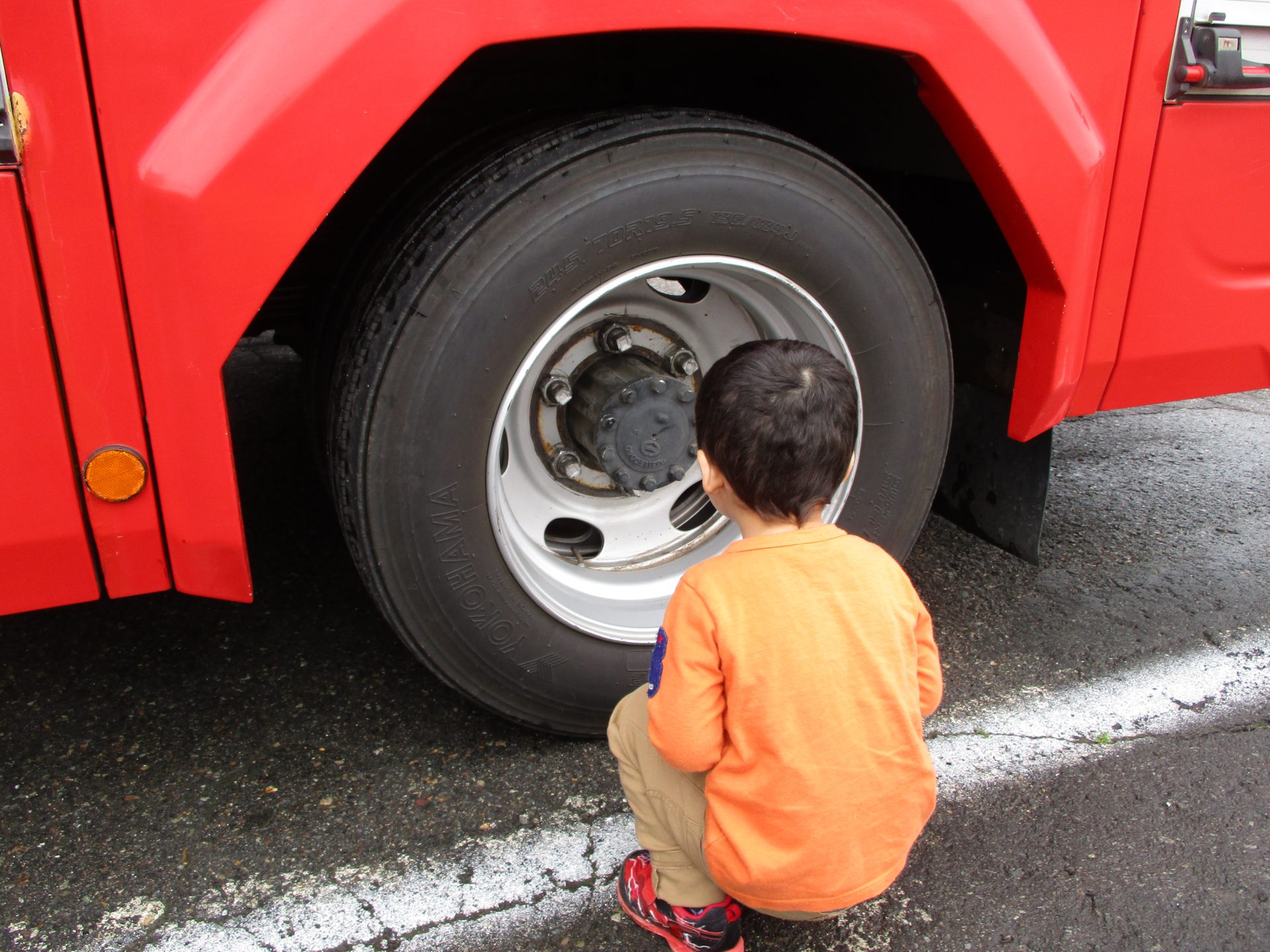 なかなか間近で見ることのできない大きなタイヤ。消防車の迫力が伝わってきますね。