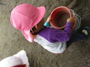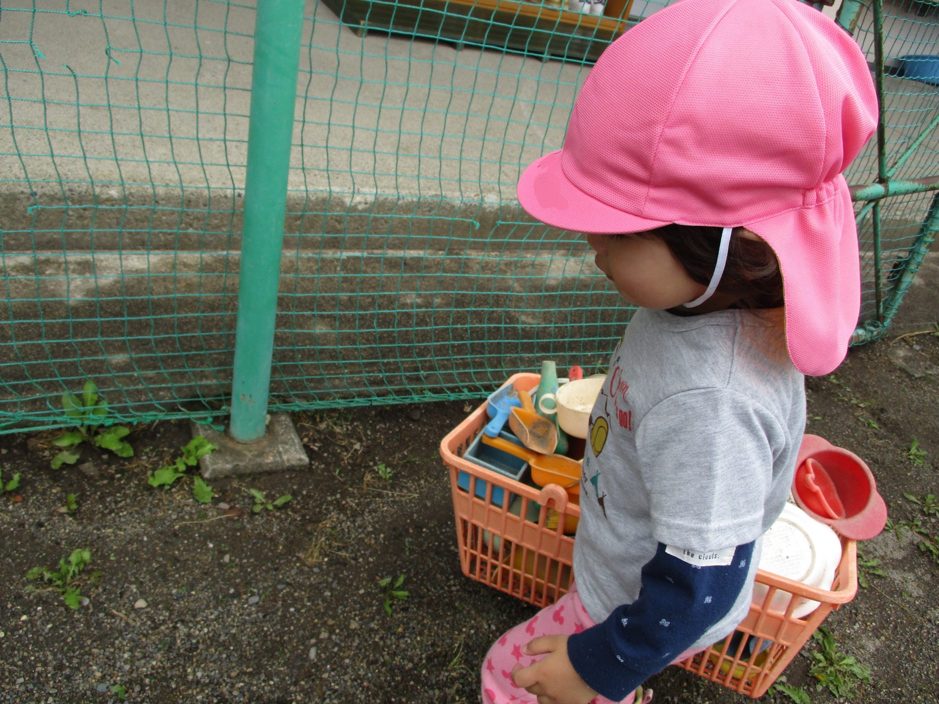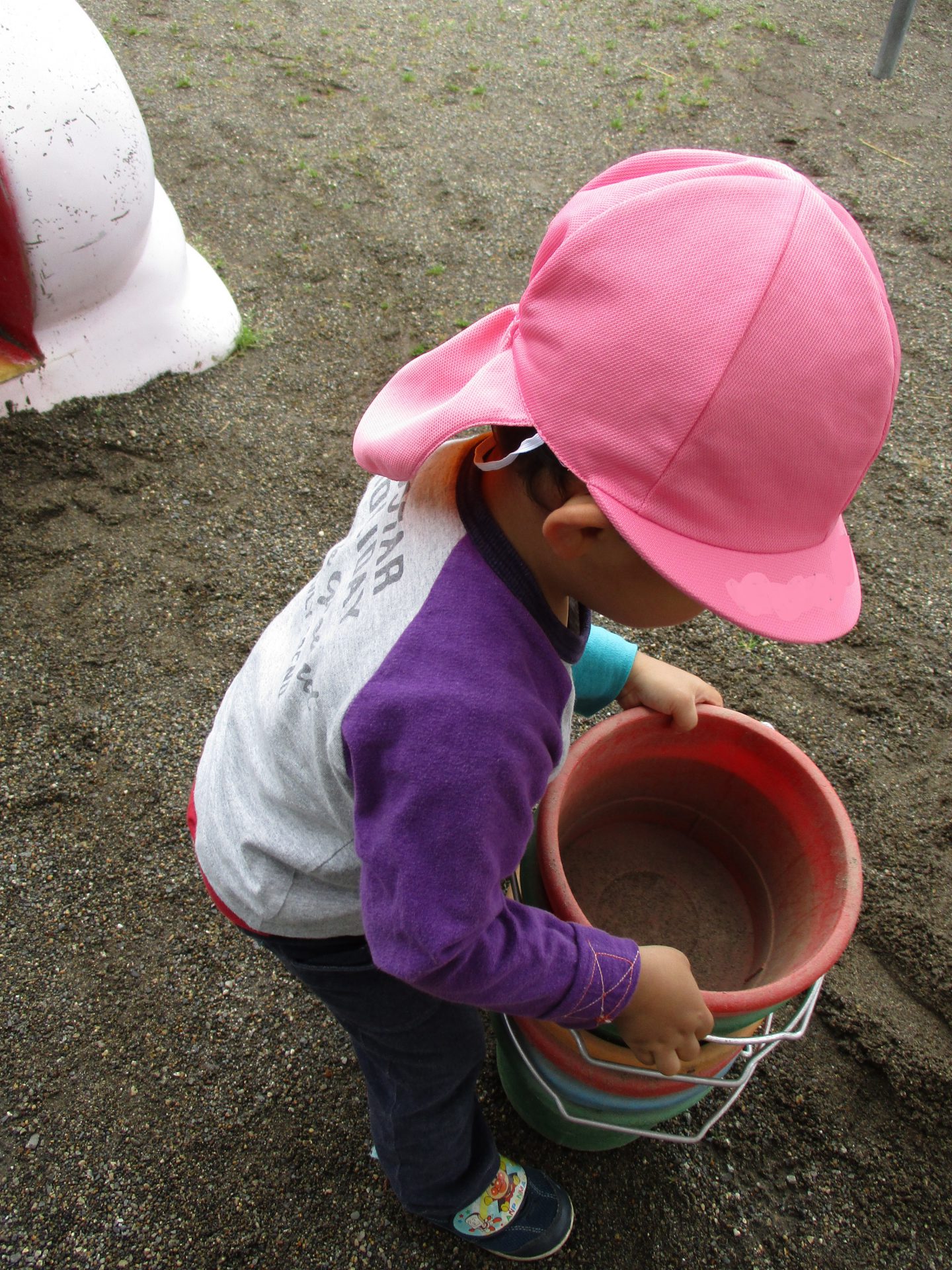 砂場を見つけ、自分のしたい遊びがあったようで、砂場道具を率先して運んでくれました。重たい道具のカゴも、バケツもなんのその!自分の力で運んでしまいます。