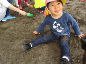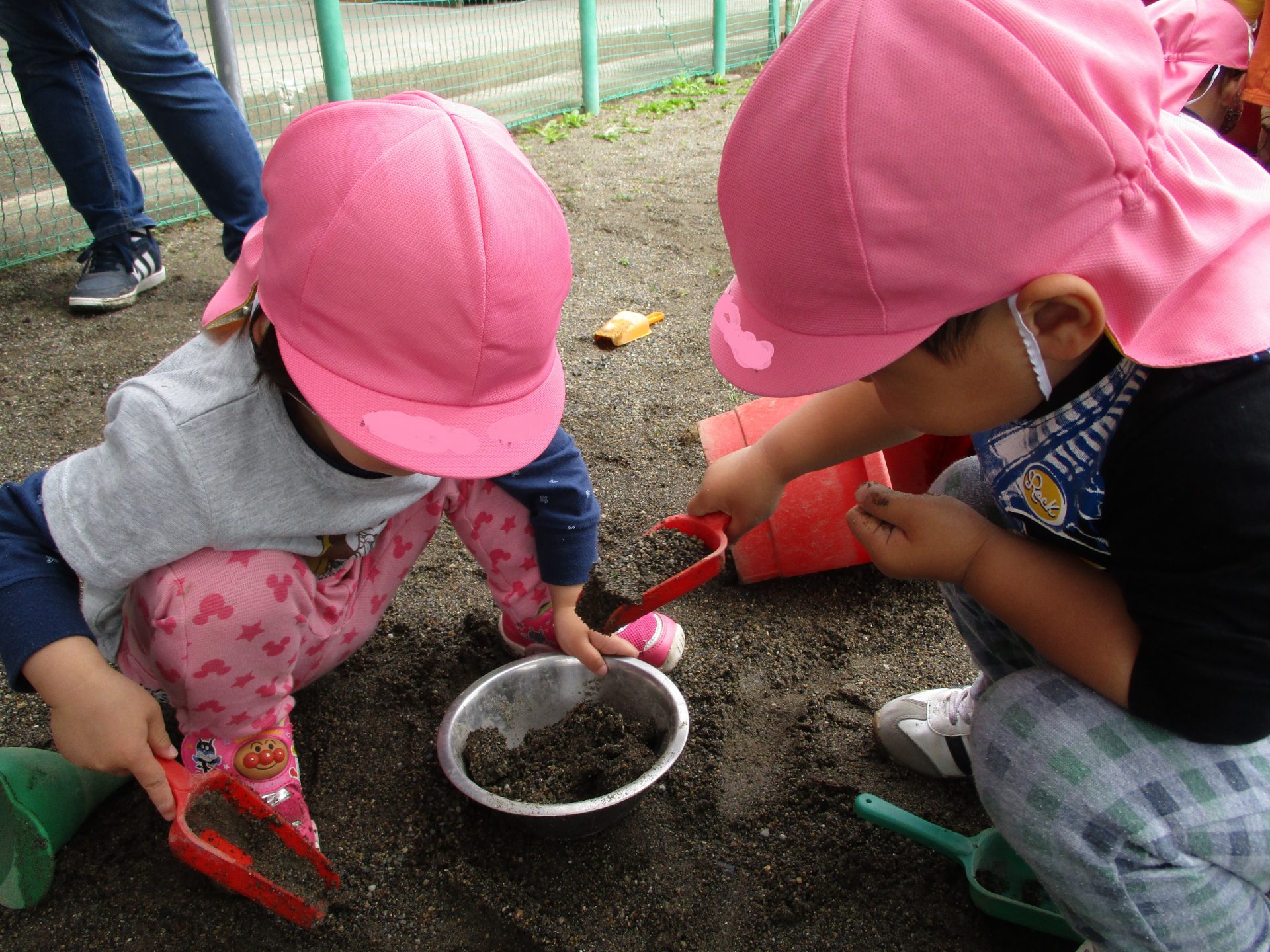 お友達と一緒にお料理を作ったり、全身で砂の気持ち良さを楽しんだりと一人ひとりのペースで砂に触れ合っていました。
