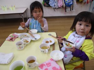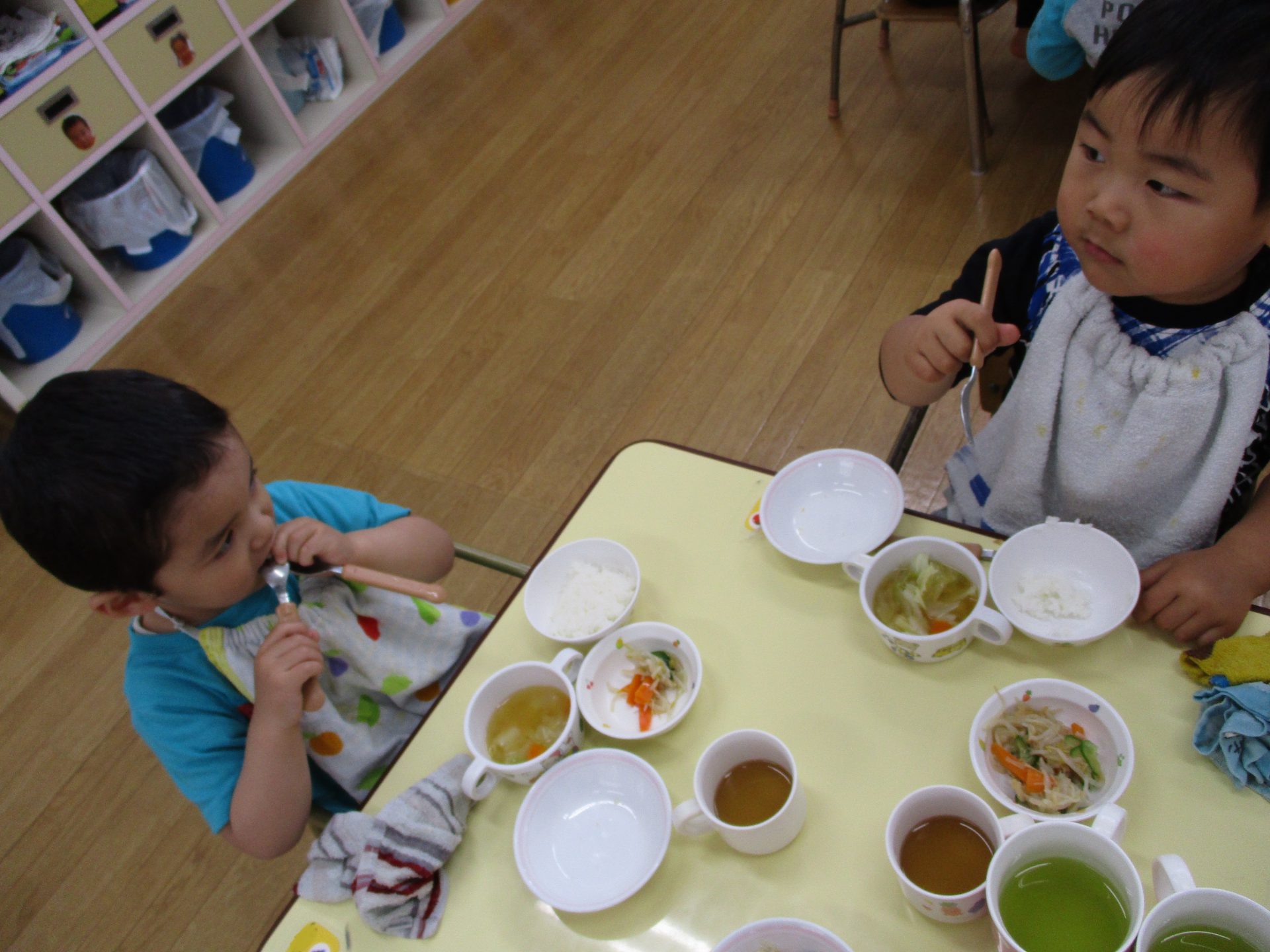 自分でエプロンをとってきて椅子に座ります。手を拭いてからみんなで「いただきま〜す」。