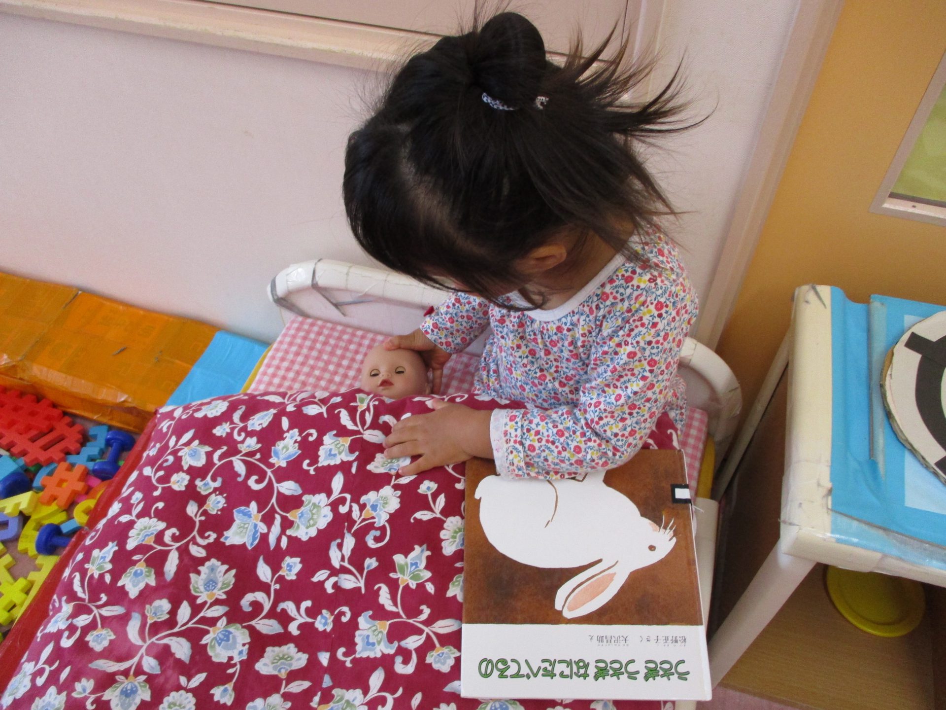 ベッドの上に座布団を乗せ、布団に見立てて、赤ちゃんの人形を寝かしつけているようです。