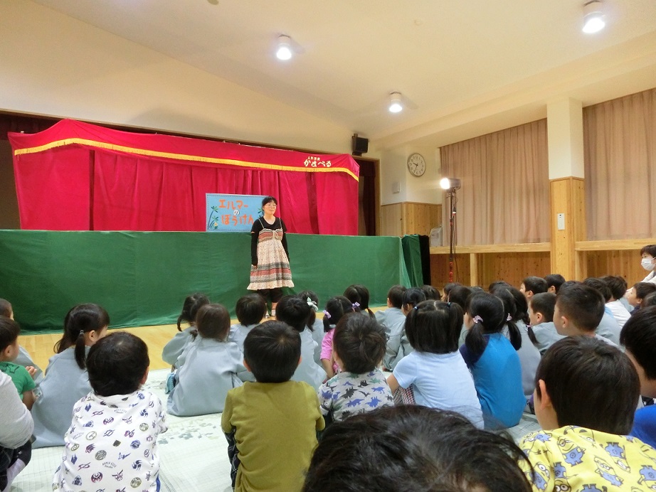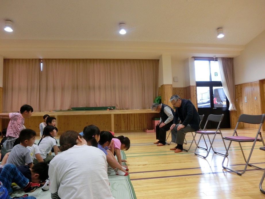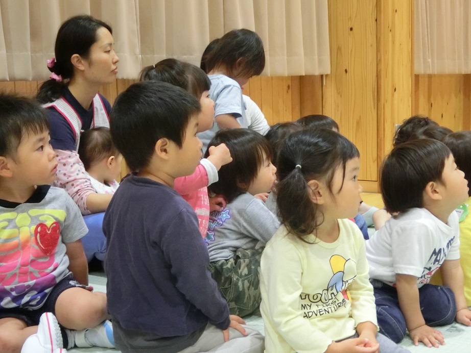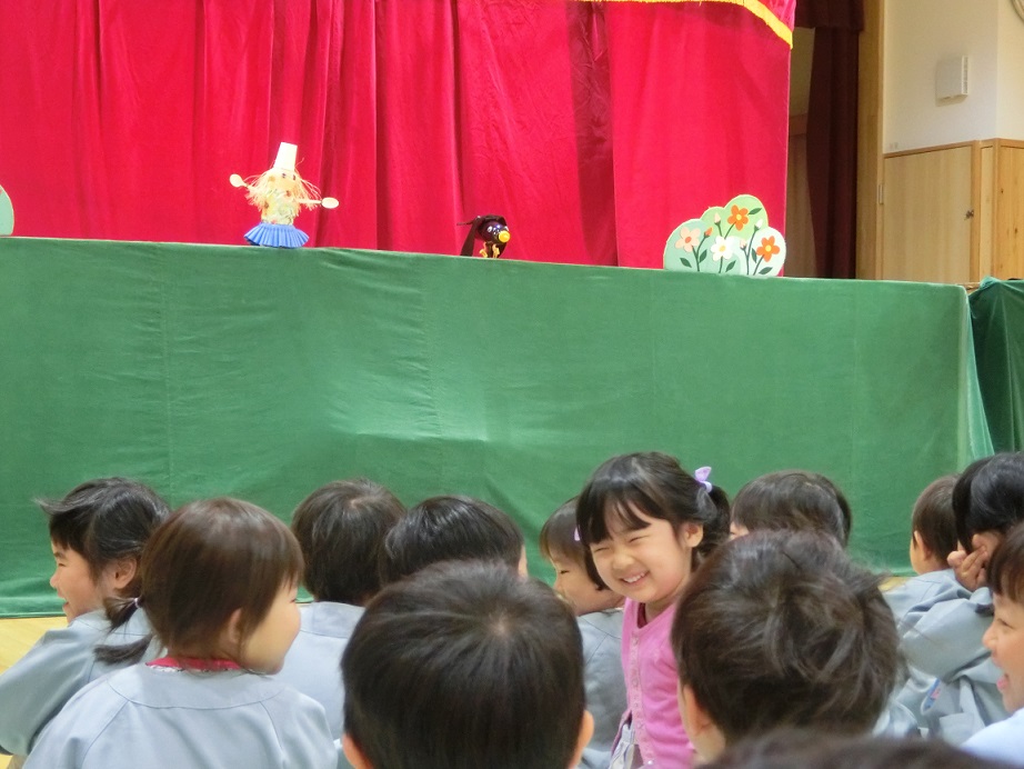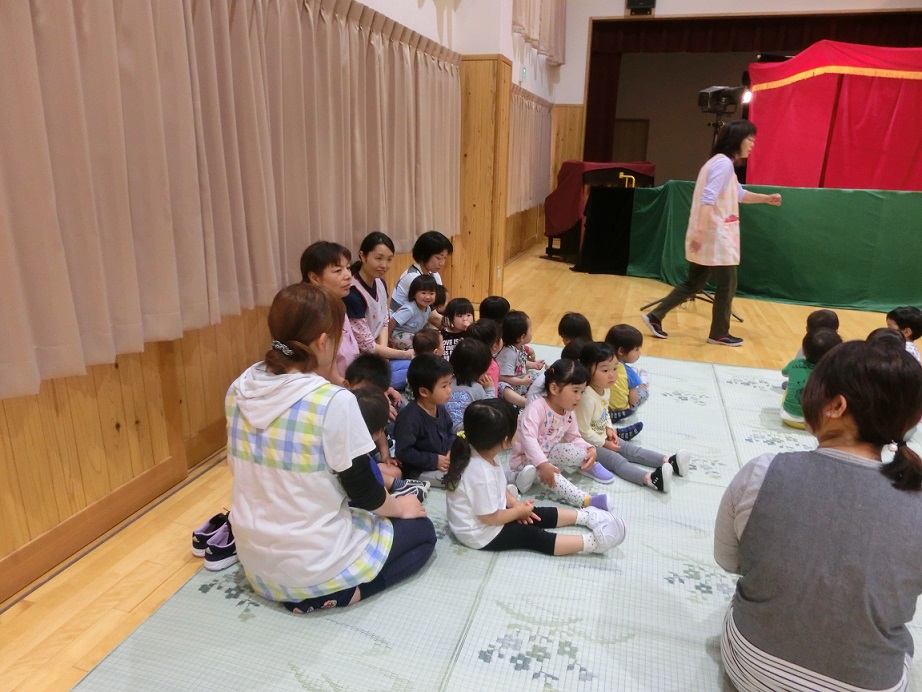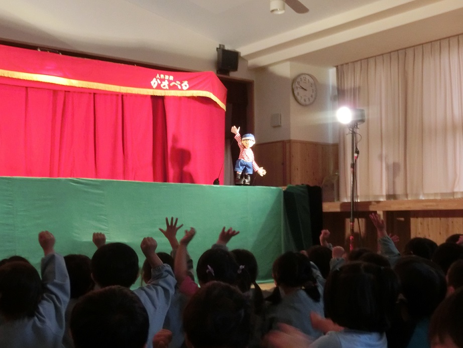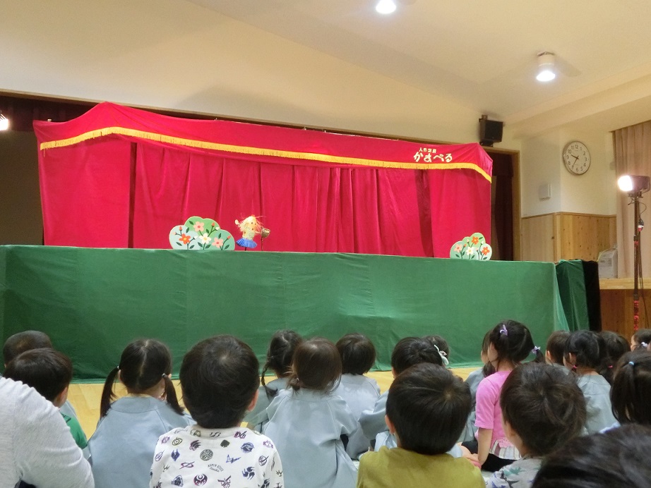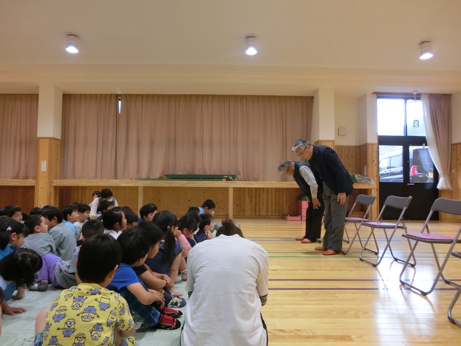 箕輪町では「ふれあい保育」があります。ふれあい保育とは地元の長寿クラブの方など地域の方と触れ合うものです。人形劇の鑑賞に併せて第1回のふれあい保育をしました。地元の長寿クラブの方2名が参加してくれました。「1年間お願いします」