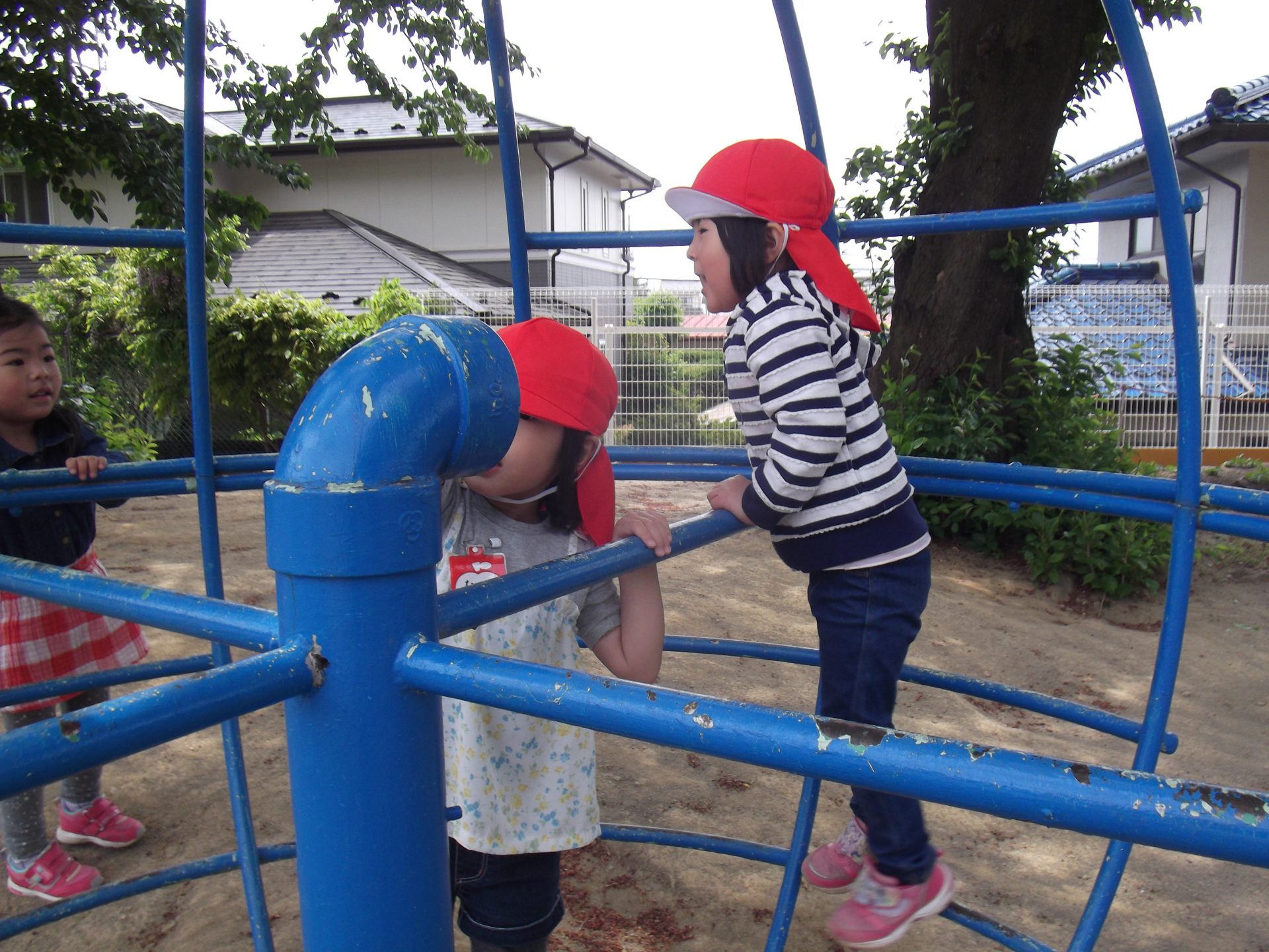 とある日の自由遊びの時間に、年少組の子どもたちがジャングルジムの中で何やら楽しそうに遊んでいました。何をしているのかのぞいてみると…??