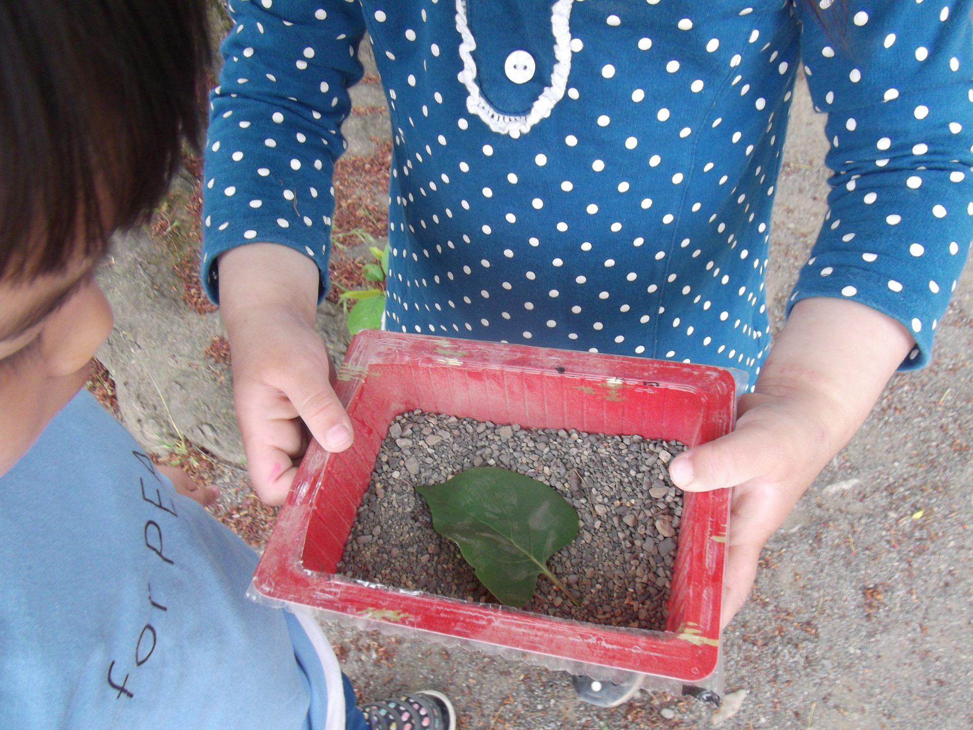 桜の木の根元に、小ぶりな枝が沢山出ています。子どもたちはそこから大きい葉や小さい葉、色の違いなど見ながら、自分たちの使いたい葉っぱを選んでいました。3歳児なりにイメージをもっておせんべい作りに取り組んでいました。
