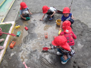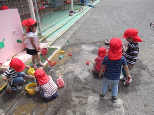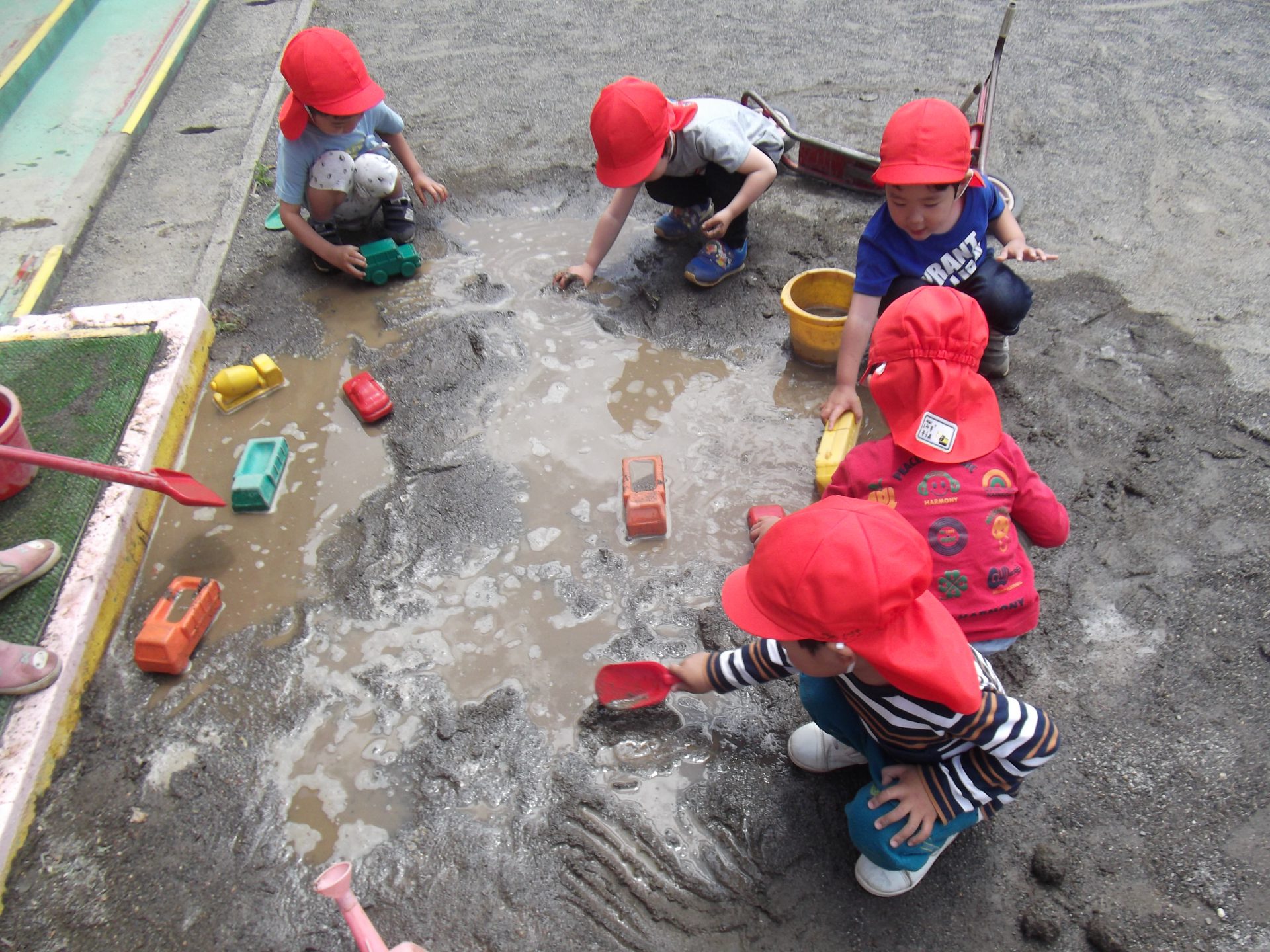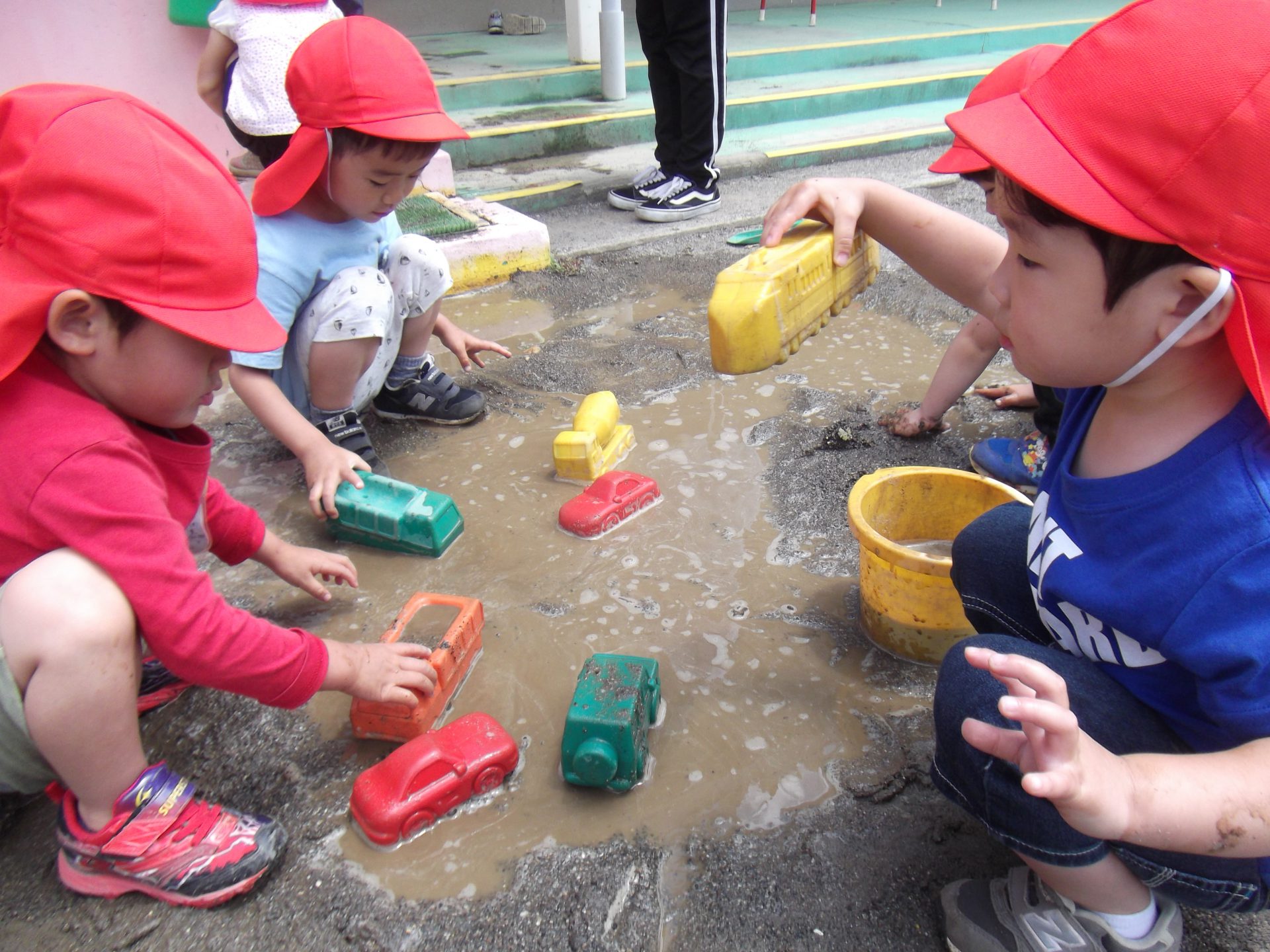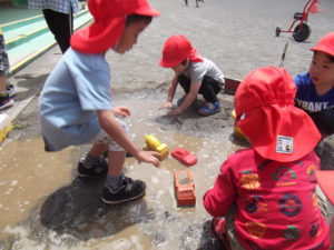 年少さんが楽しそうに水道の前に集まっていました。仲間に入れてもらうと、「せんせいはおだんごつくって」「パーティーしよう」「車がしずむ~」など、一人ひとり楽しみ方があるようです。それでも、同じ場所でみんなと一緒に過ごす時間は、とても楽しい時間なんだろうなと、子どもたちの笑顔を見て感じました。これからもっともっと一緒に遊んで、仲良くなってね!!