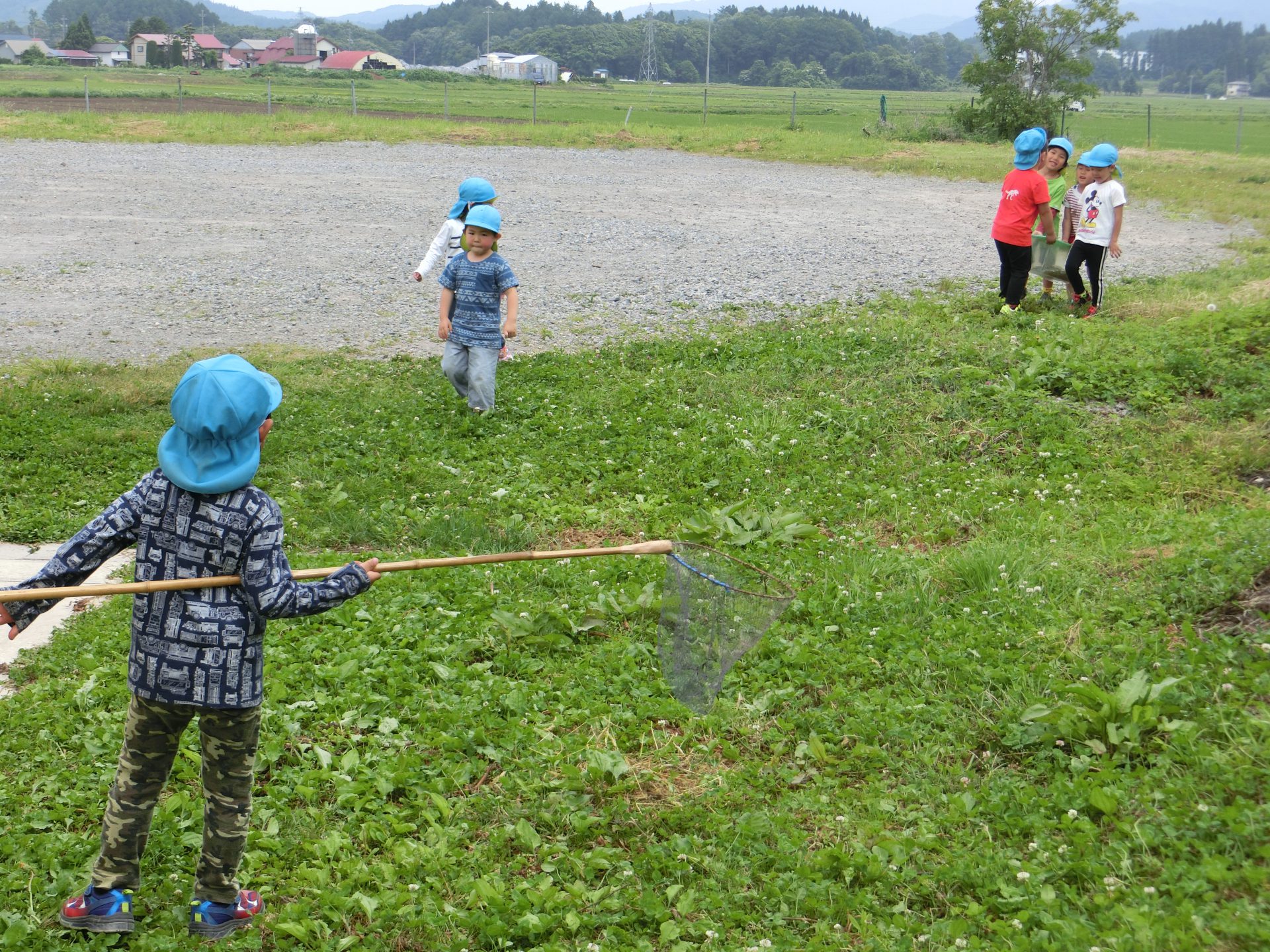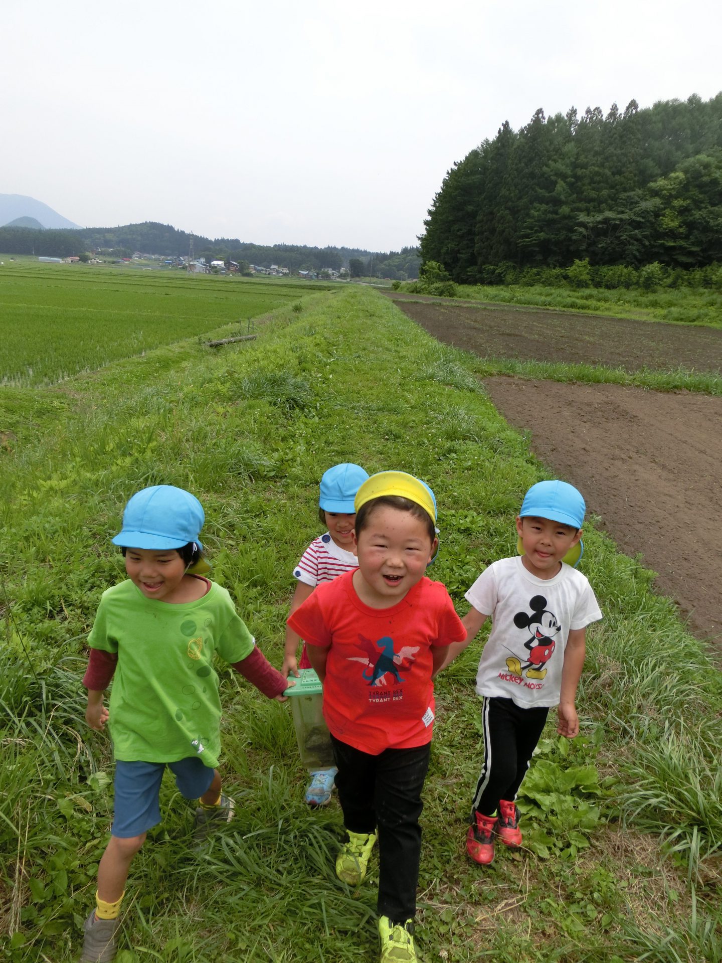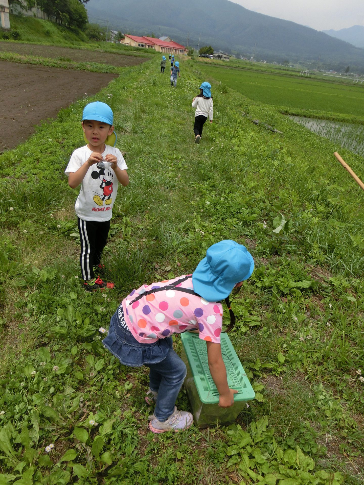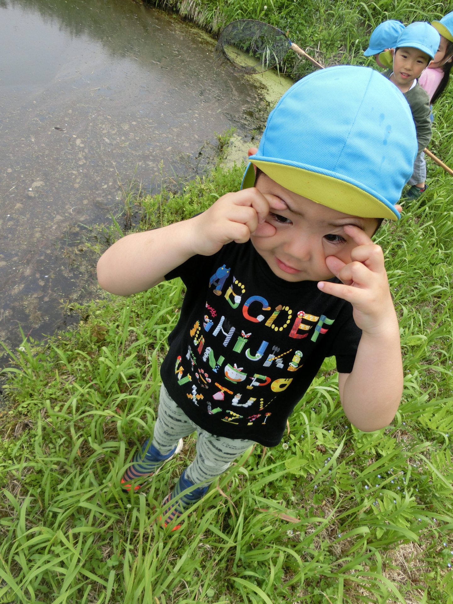 5月、散歩に出かけると、田んぼにオタマジャクシを発見!「いいなー!ほしいね。」でもかなり園から離れた田んぼで道具もなかったので眺めるだけでした。