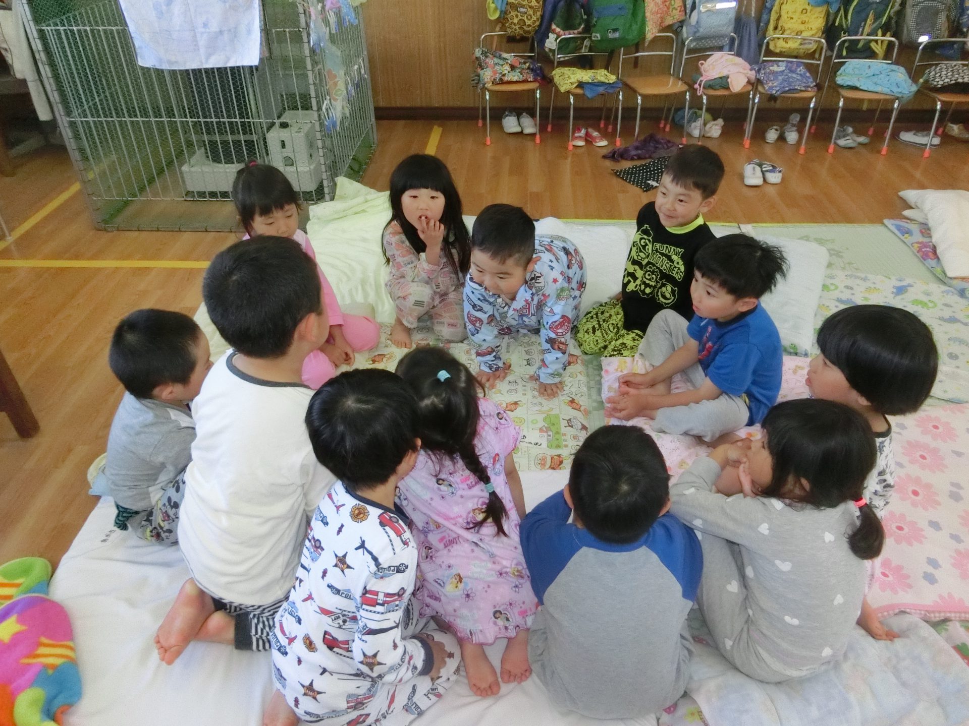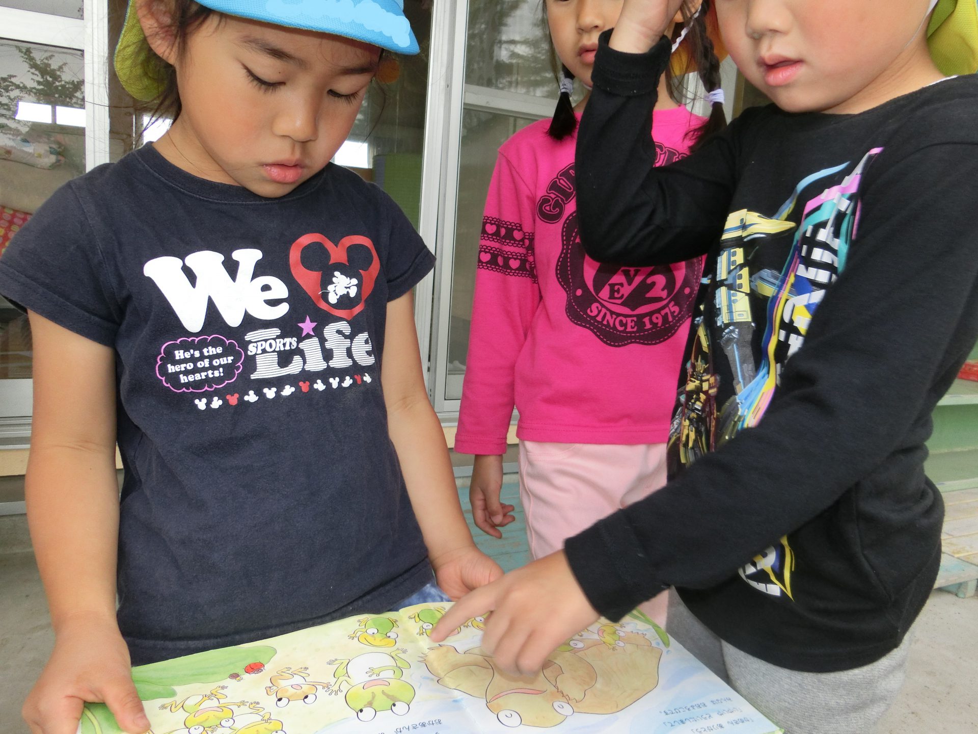 「オタマジャクシはご飯粒を食べるけど、カエルって何食べるのかな?」 「虫?かなー?」自信を持って答えられる子はいません。「お休みの間に死んじゃうかもしれない。」「せっかく捕まえたのに‥」すると一人の男の子が「朝捕まえて夕方逃すことにすれば?で、次の日にまたつかまえればいいんだよ!」と提案してくれました。