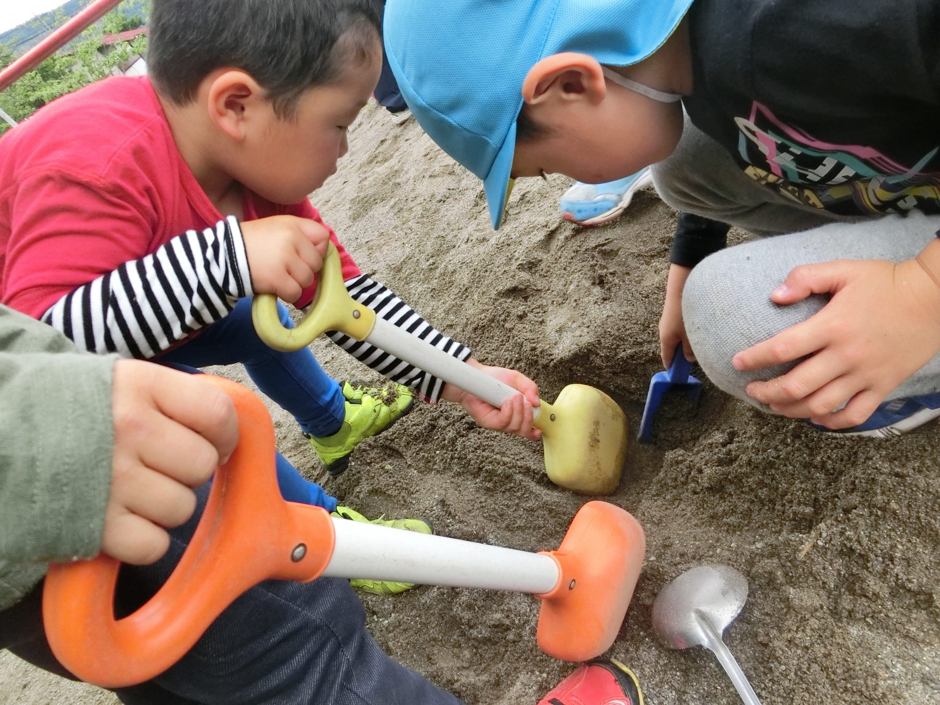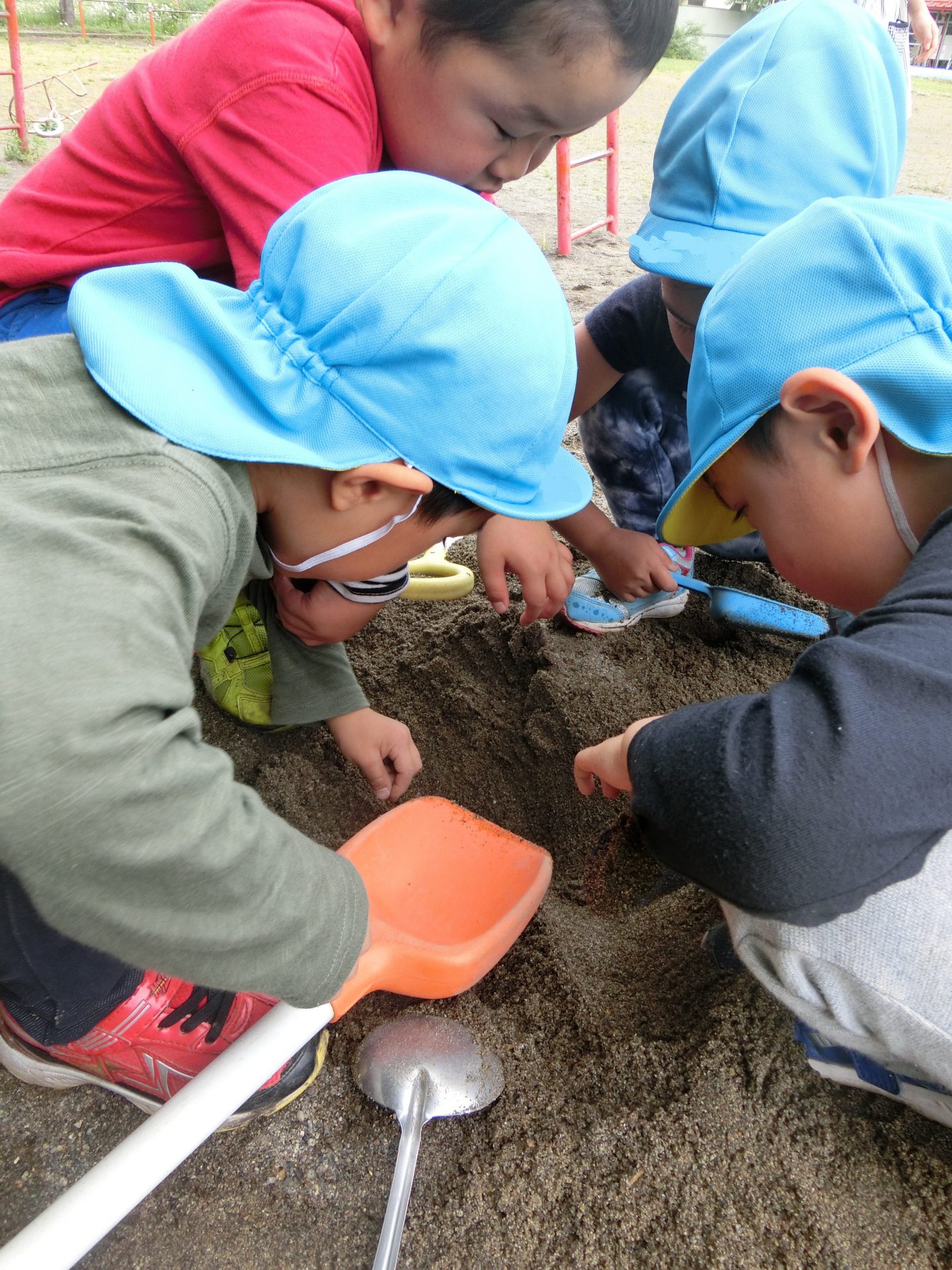 その後外へ出て遊ぼう!ということになり、他のクラスの友達が砂場を掘っているのを見て「ここじゃだめだ!」と気付いたみんなは慌てて掘り返します。かなりがんばって掘っていましたが小さなカエルは見つからず「あーあ…」とため息をついていました。