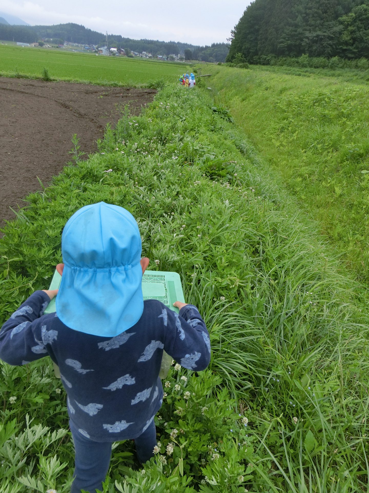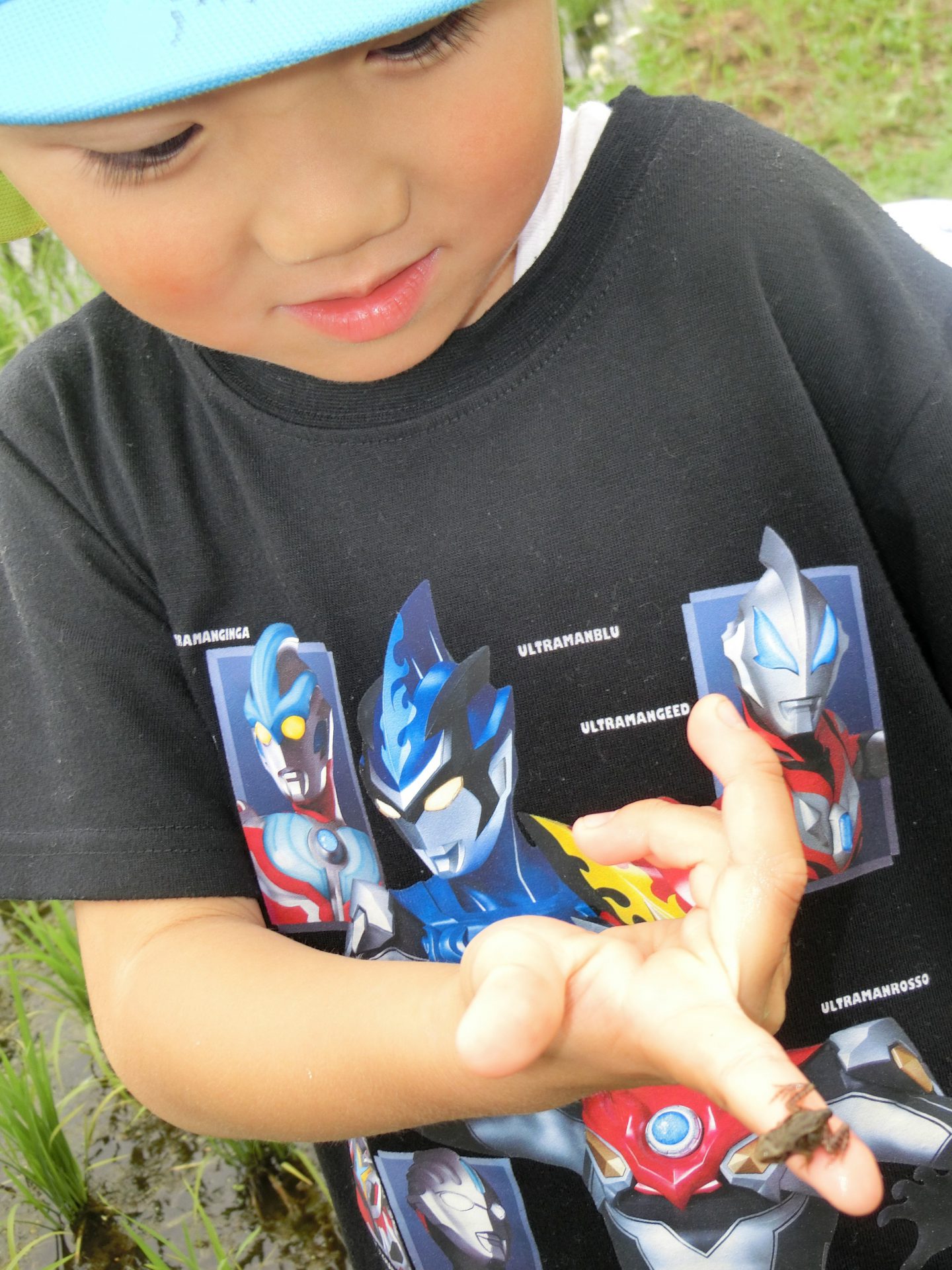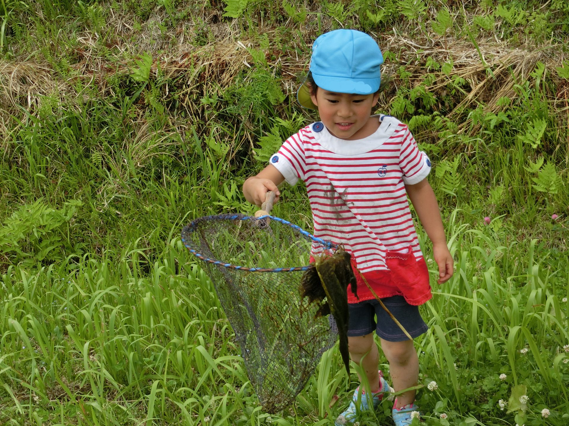カエルを逃してしまったので水槽が淋しくなってしまいました。その頃、大好きな田んぼへ探索に行くとトノサマガエルと大きなオタマジャクシを発見!「とりたいなー」「でも田んぼに手突っ込んじゃいけないんだよ!」と話していました。農家の子かな?えらいですね!「何か道具を持ってきたらいいんじゃない?」と声をかけてみると「じゃあ行ってくる!」と走っていき戻ったみんなの手には、虫取り網、プリンのカップ、つかまえたときの水槽。