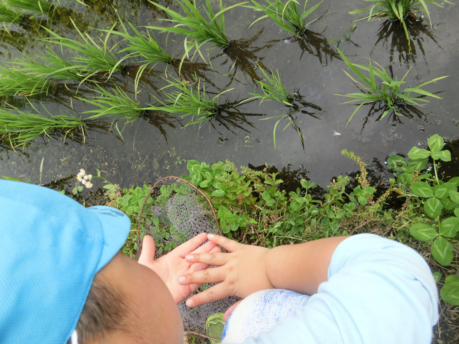 稲がない場所を見つけてチャレンジし続けると、そーっっと近づいてさっとすくう!とうまくとれそう、とコツをつかんだ子が獲り始めました!
