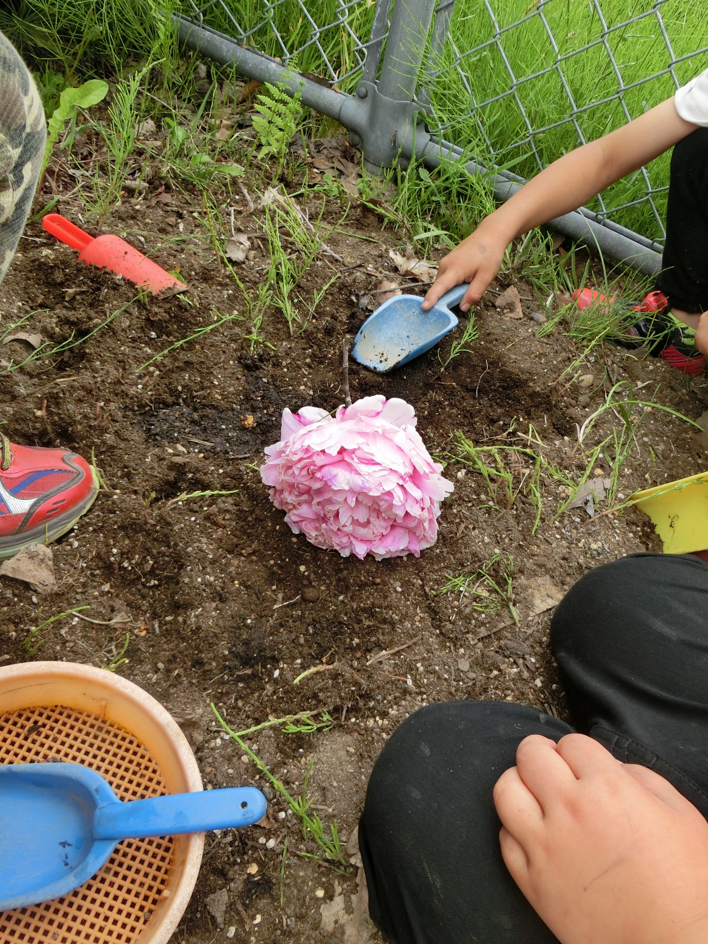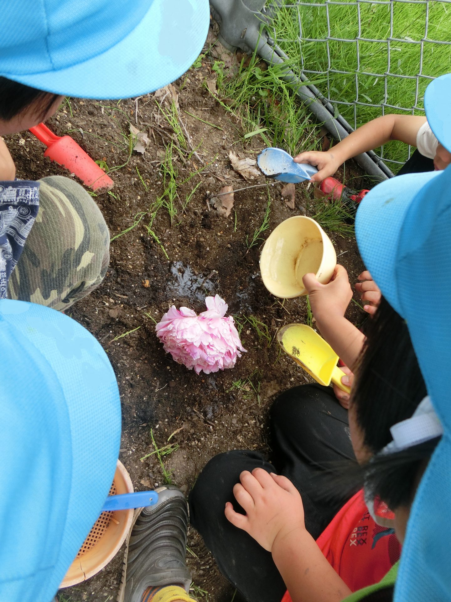 お墓作りも何度かしているとコツが分かってきました。「なるべくいっぱい掘ってあげよう」「お花置いてあげよう」オタマジャクシやカエルに気持ちを寄せる姿がありました。すると「水かけてあげよう」と水を運んできた子がいました。お墓参りに行ったことがあるのかなと思いながら「どうして水あげるの?」と聞くと、
