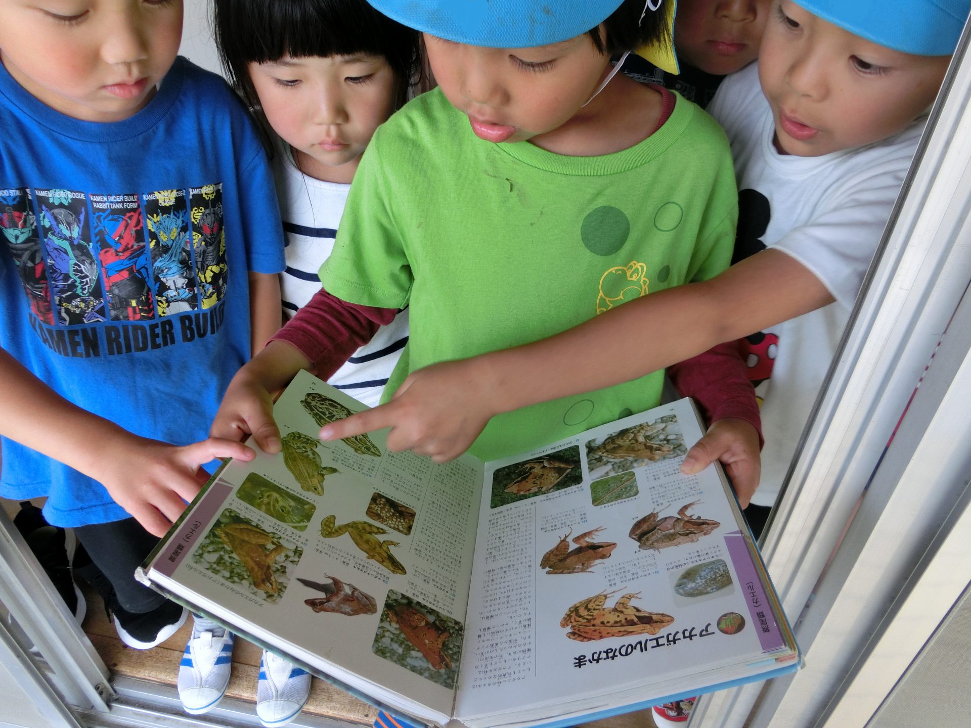 図鑑で調べてみましたが、カエルの餌は載っていませんでした。どうしても飼いたい!「お家の人にカエルのご飯を聞いてこよう、そうしたら飼えるかも…」ということになりました。