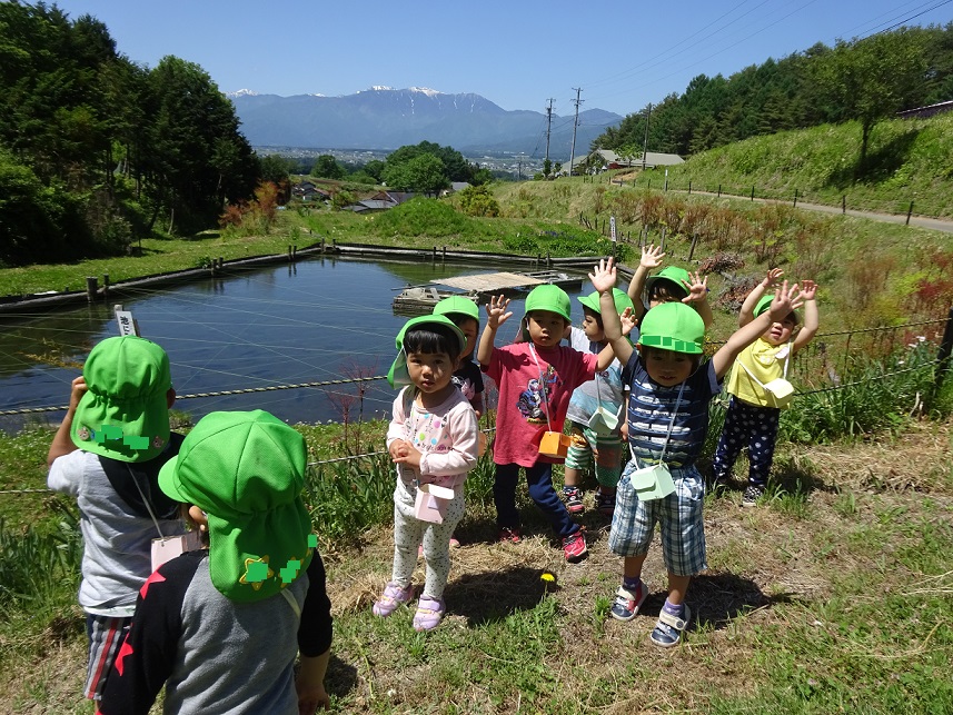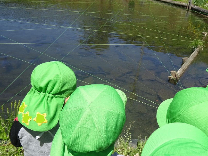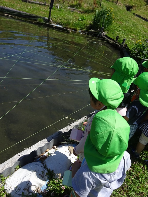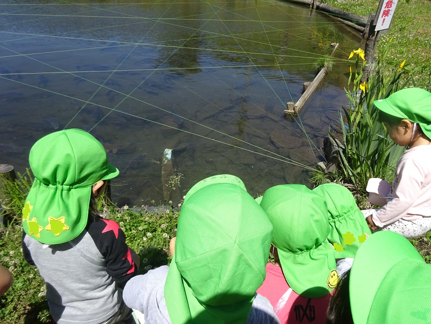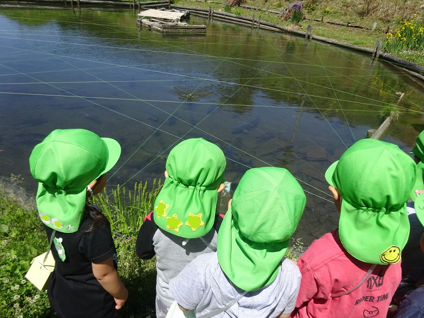 鯉を見つけてとても興味深く見ていました。「魚!魚!」と言っていたので「鯉」という名前を教えたのですが保育園に帰ってきた時にはみんな忘れていてもう少ししたら覚えられるのかなと思いました。