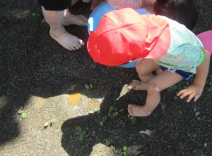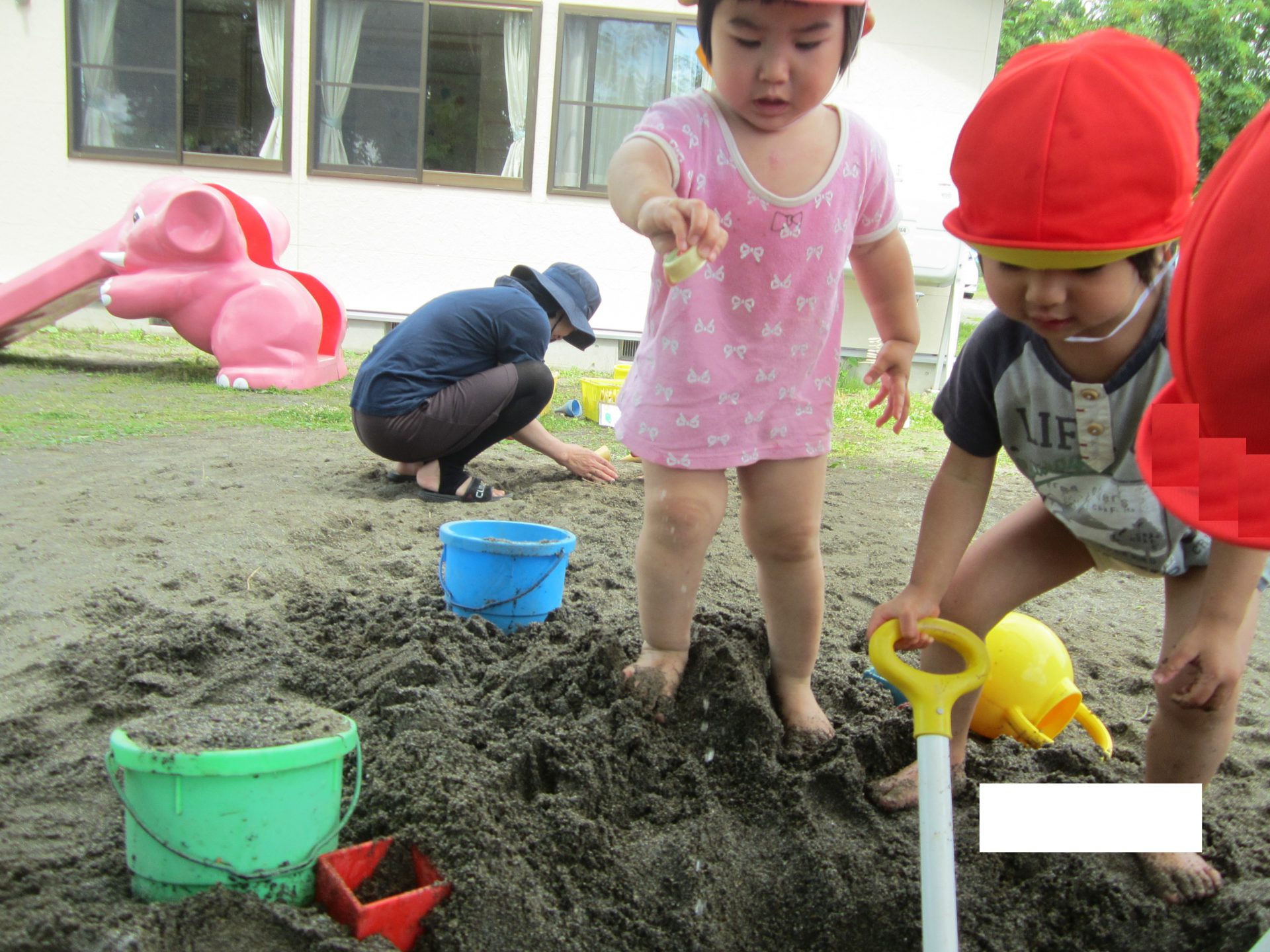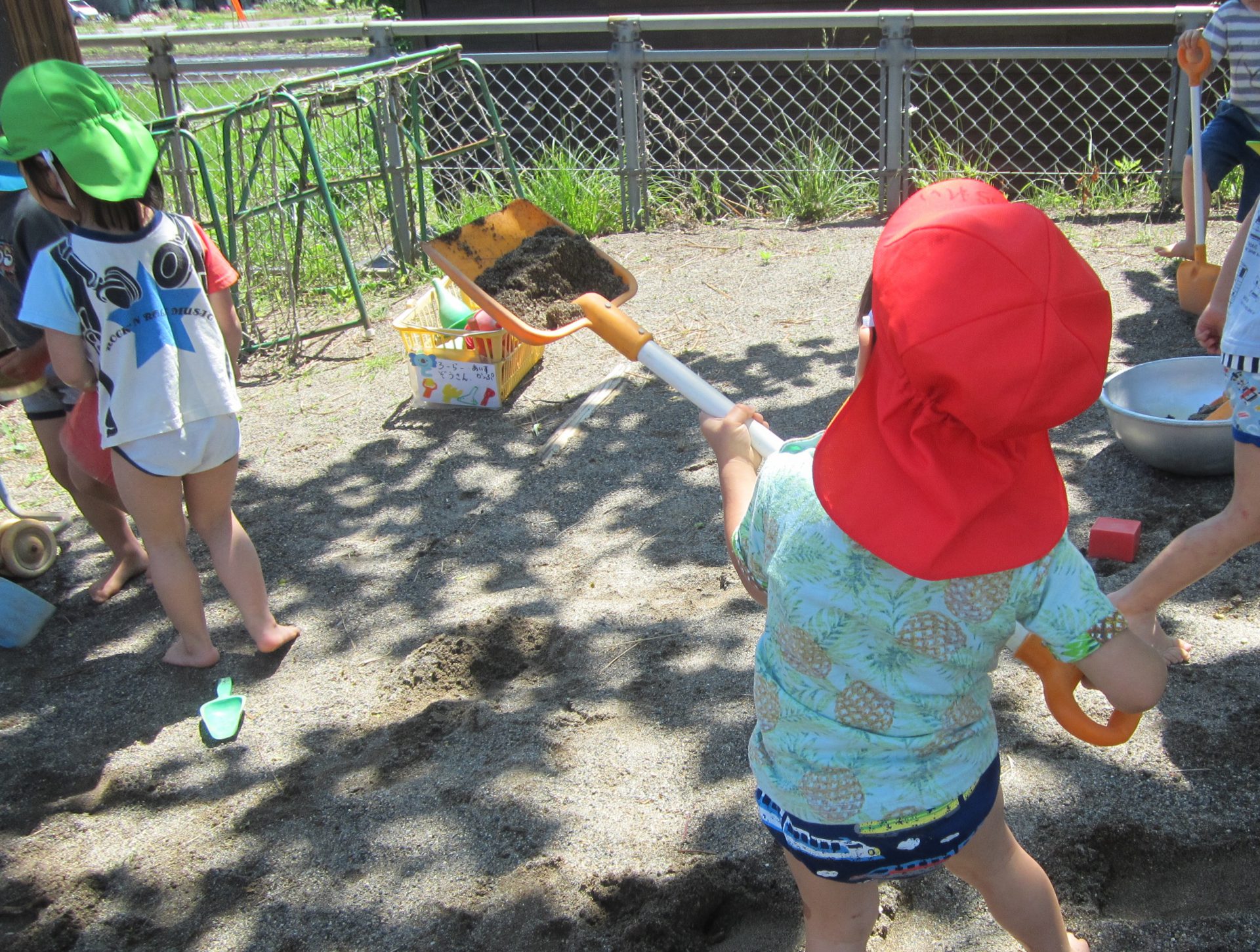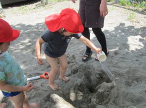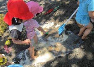 今回、小さな水たまりを見つけたことからお風呂づくりに発展したり、どの道具を使ったらイメージ通りに出来るか試しながら考える姿も見られました。子どもたちが保育者からではなく興味の持ったことを自分たちで見つけて探究することで、夢中で取り組みますし、「自分で出来た」と達成感もあったようでその笑顔は本当にまぶしかったです。また、その活動の中で物の性質にも気づき、次の活動にも繋がっていくのではないかと思います。これからも子どもたちの発見に気づき、時には言葉をかけて刺激を入れつつ活動を見守っていきたいです。