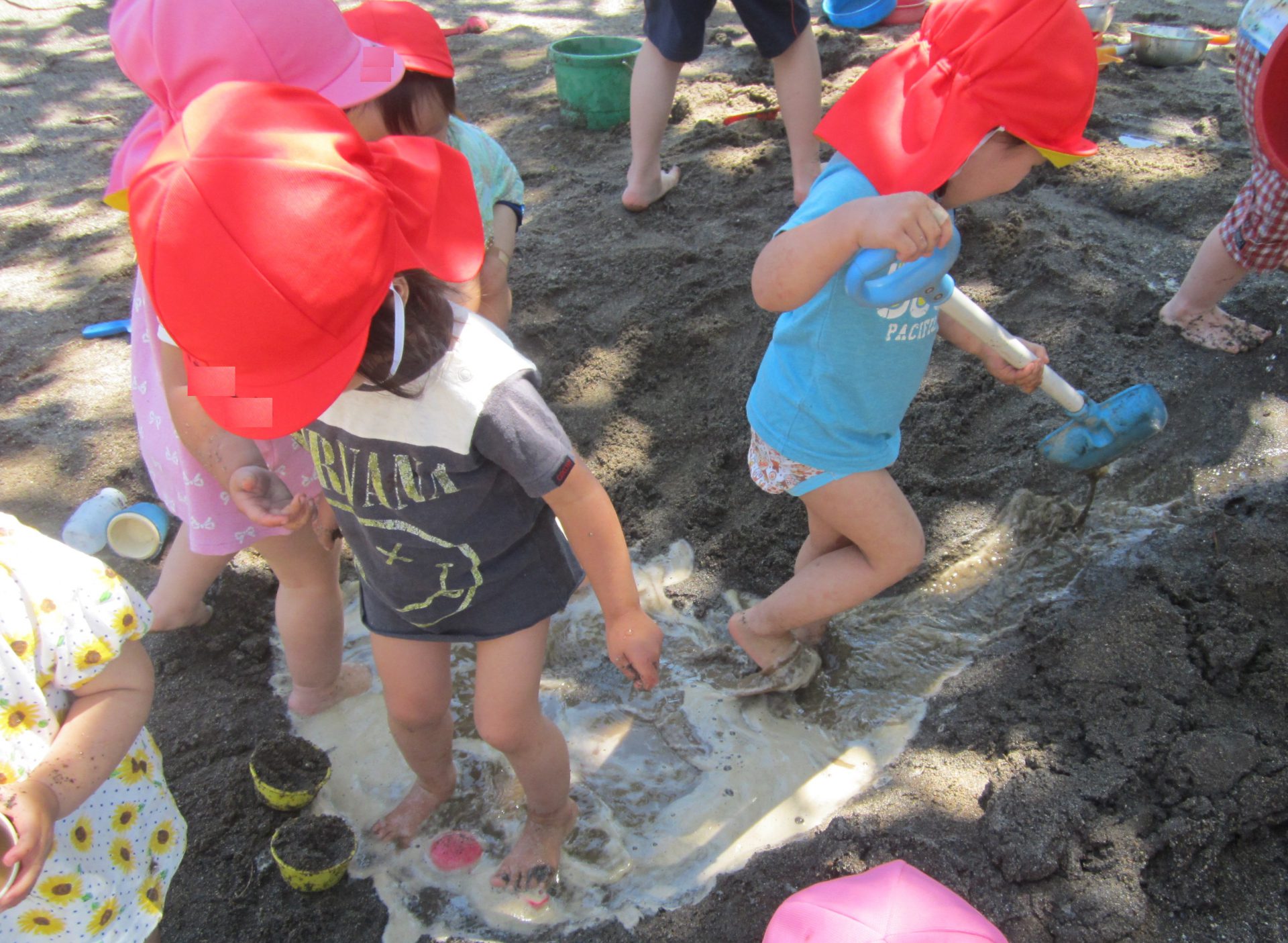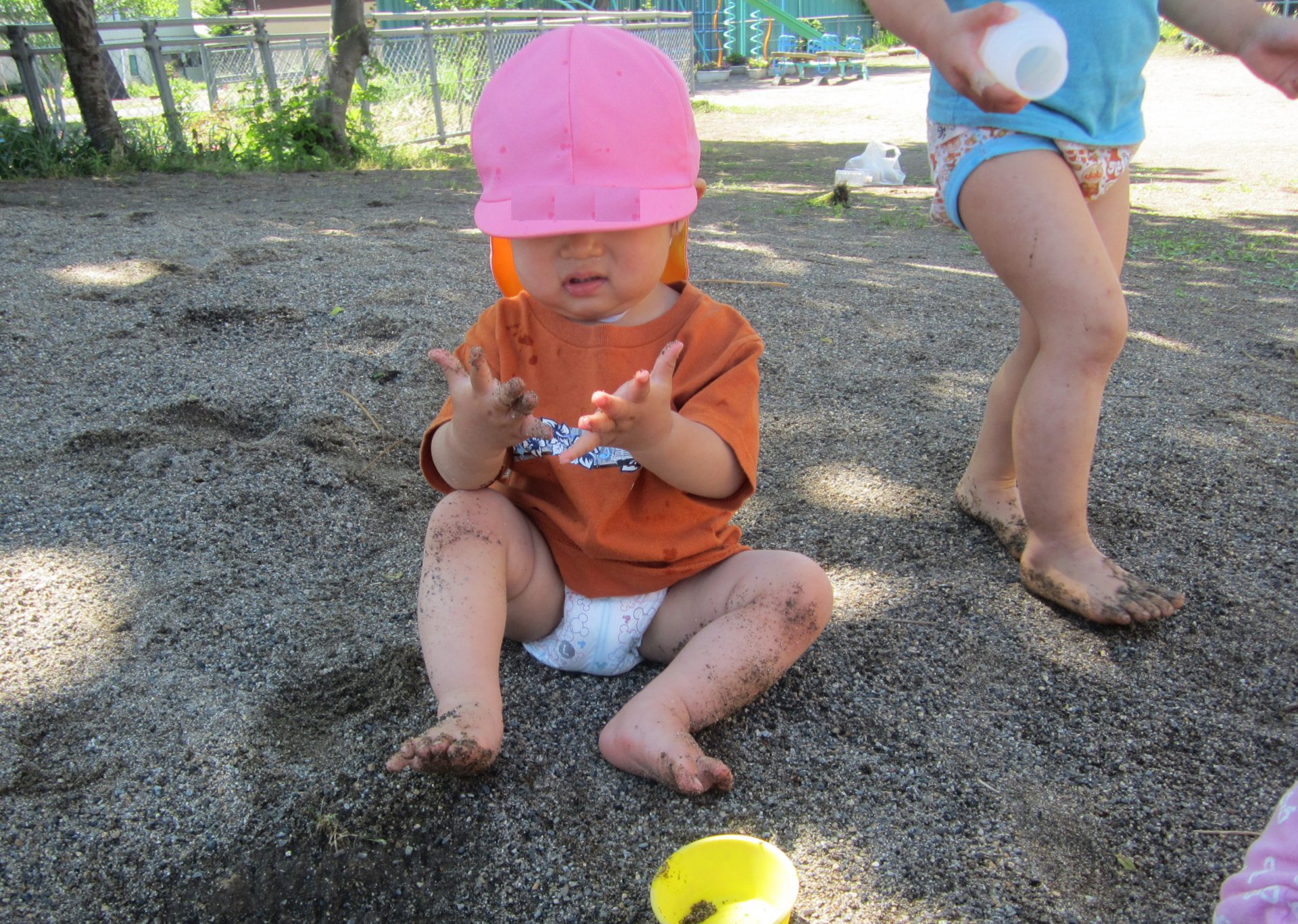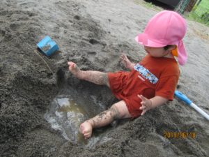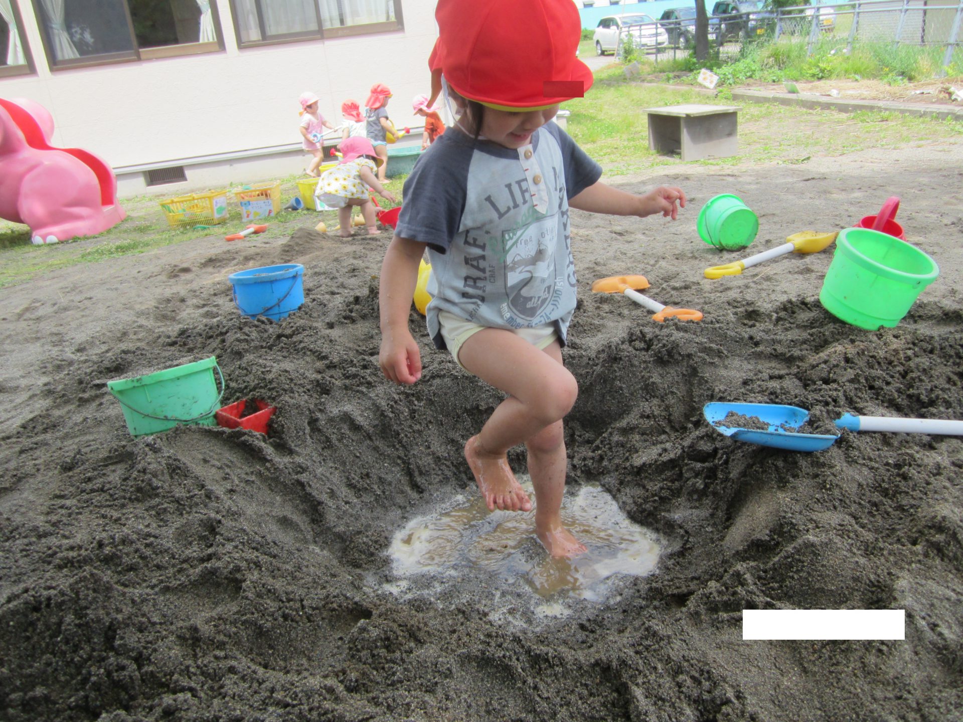どろんこ遊びは砂のザラザラ、サラサラ感や温かさ、冷たさを肌で直接触れることができます。最初は砂の上を裸足で歩くことから驚き、慎重に砂に足をつけ始める子もしばらくするとすっかりどろんこ遊びの虜で「気持ちいい」「ぐちゃぐちゃ」と良い表情で感触を楽しんでいました。まだ、言葉で自分の感じたことを話すことができない1歳のお友だちでも、水や砂に触れて繰り返し遊んでいる姿を見ると、たくさんの刺激を受けながら、いろいろなことを考え探究しているのではないかと感じました。そんな子どもたちが感じたこと、持っている探究心を大切に一人一人と遊びを通して共感しながら関わっていきたいと思います。
