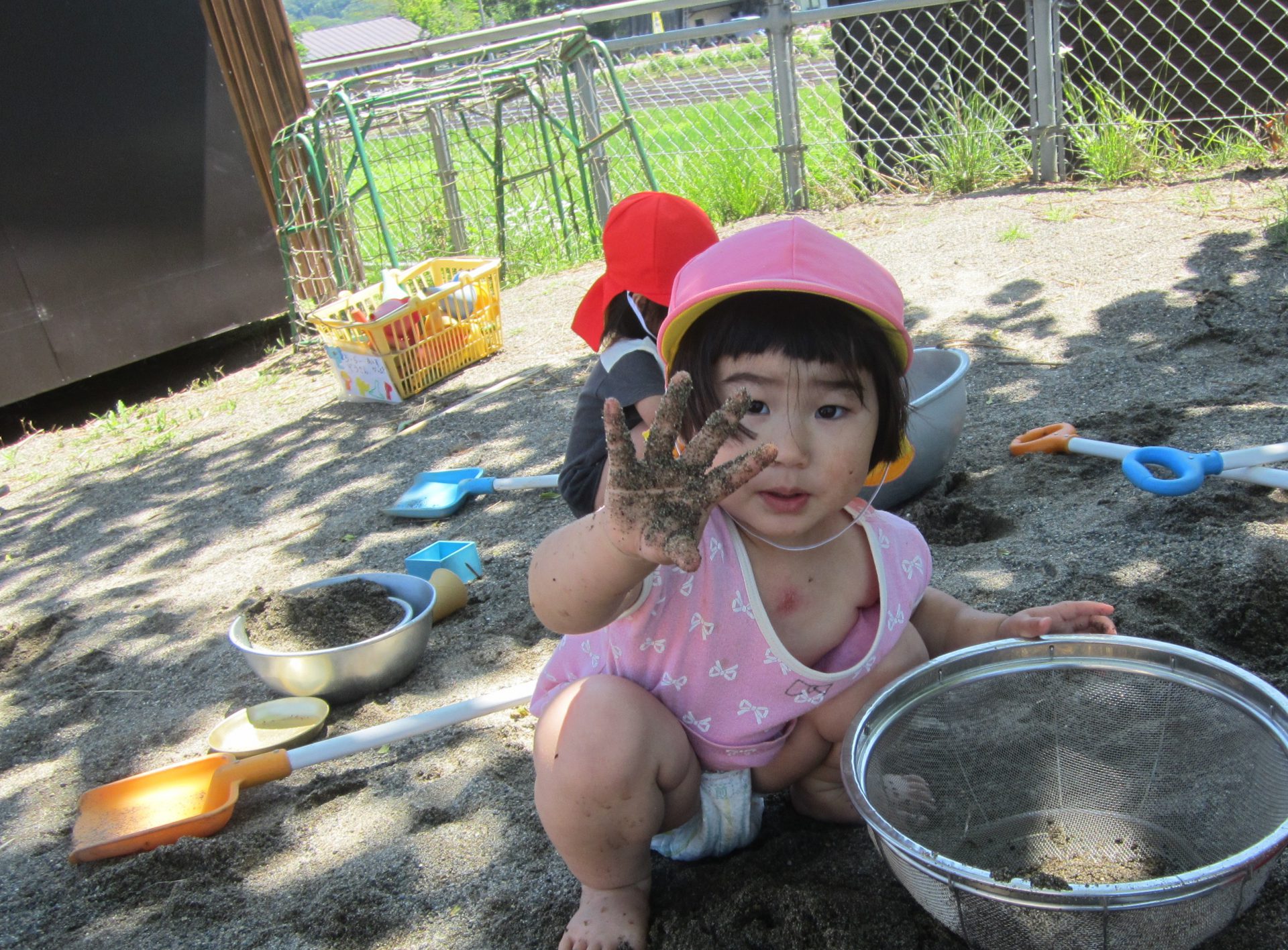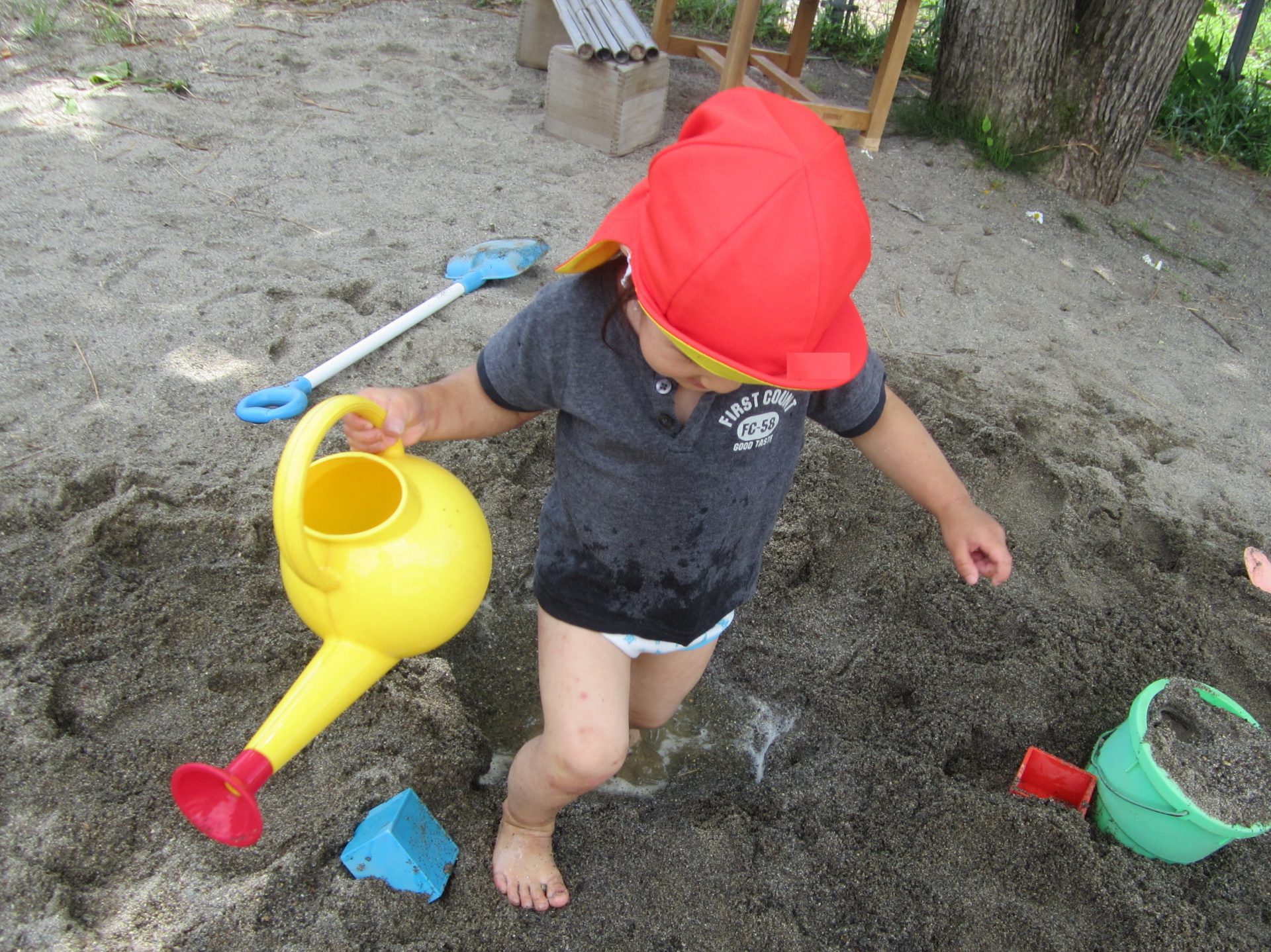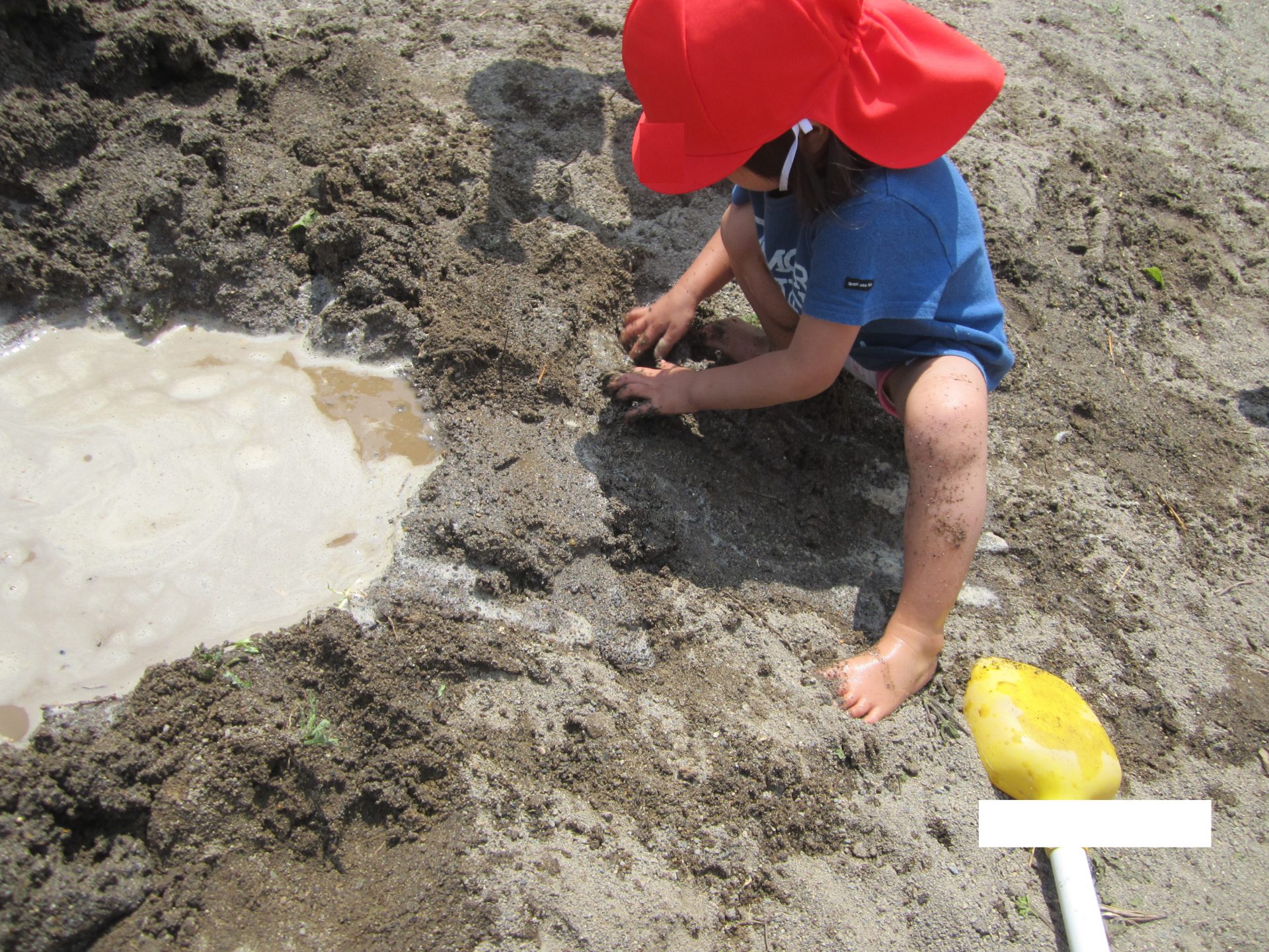 どろんこ遊びは砂のザラザラ、サラサラ感や温かさ、冷たさを肌で直接触れることができます。最初は砂の上を裸足で歩くことから驚き、慎重に砂に足をつけ始める子もしばらくするとすっかりどろんこ遊びの虜で「気持ちいい」「ぐちゃぐちゃ」と良い表情で感触を楽しんでいました。まだ、言葉で自分の感じたことを話すことができない1歳のお友だちでも、水や砂に触れて繰り返し遊んでいる姿を見ると、たくさんの刺激を受けながら、いろいろなことを考え探究しているのではないかと感じました。そんな子どもたちが感じたこと、持っている探究心を大切に一人一人と遊びを通して共感しながら関わっていきたいと思います。