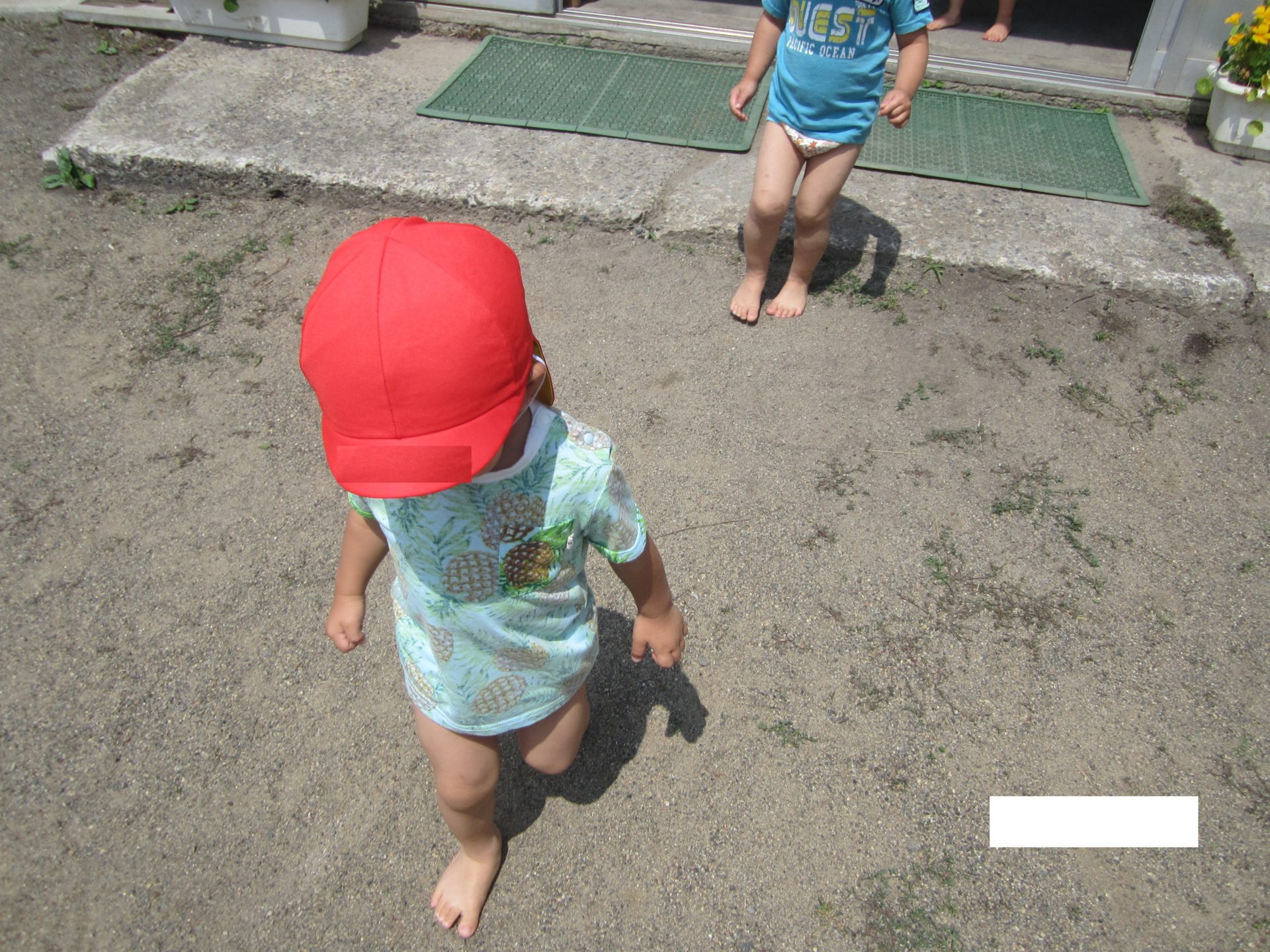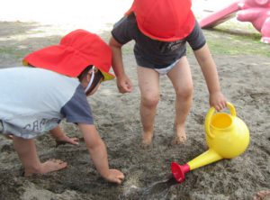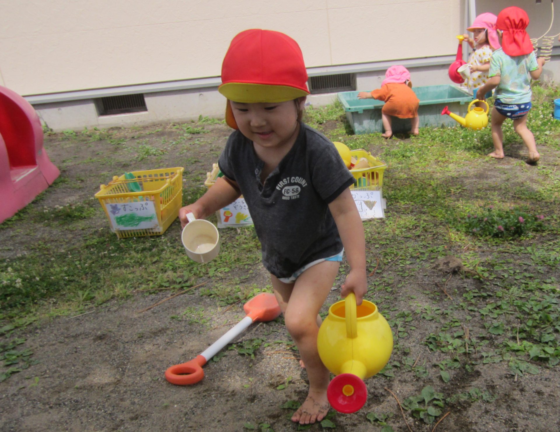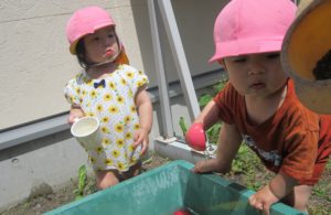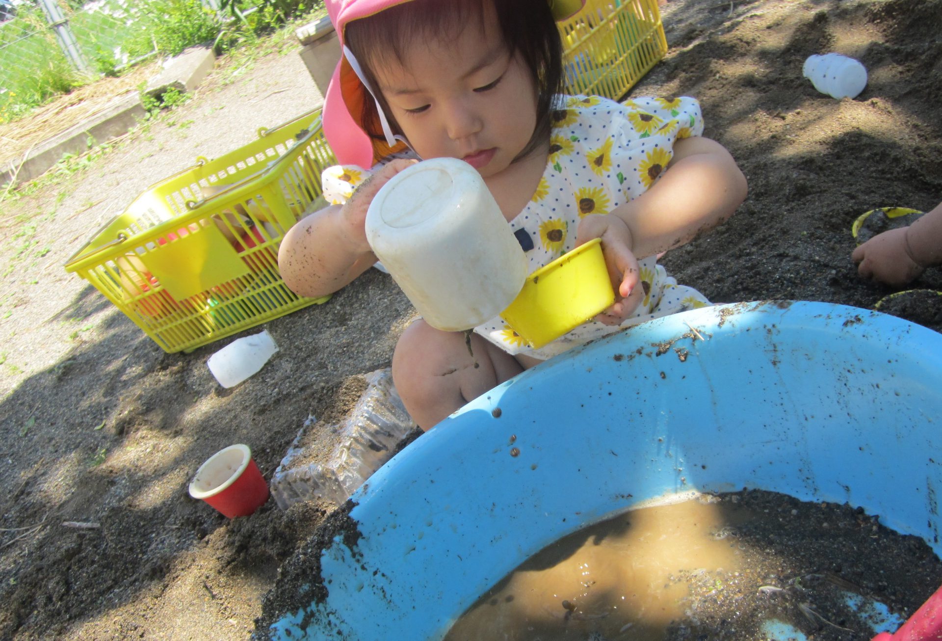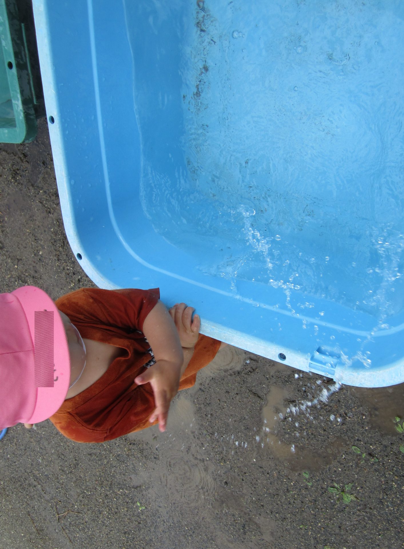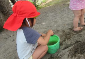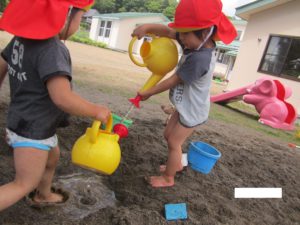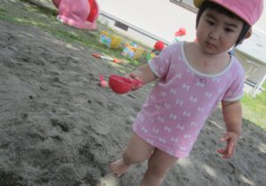 4、5月と砂遊びを楽しんできた1、2歳児のお友だちですが、猛暑の日には小さなたらいに水を入れて気持ちいい!と喜んで遊ぶ日もありました。