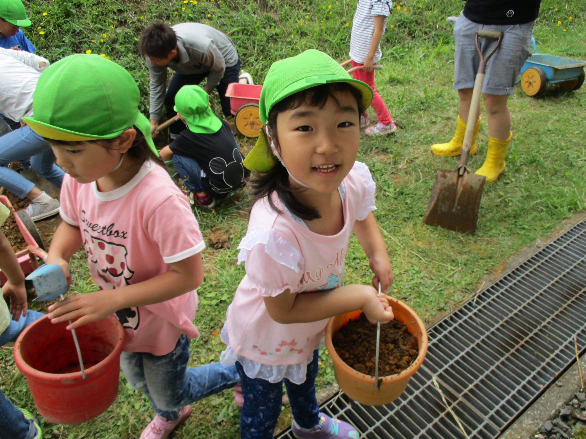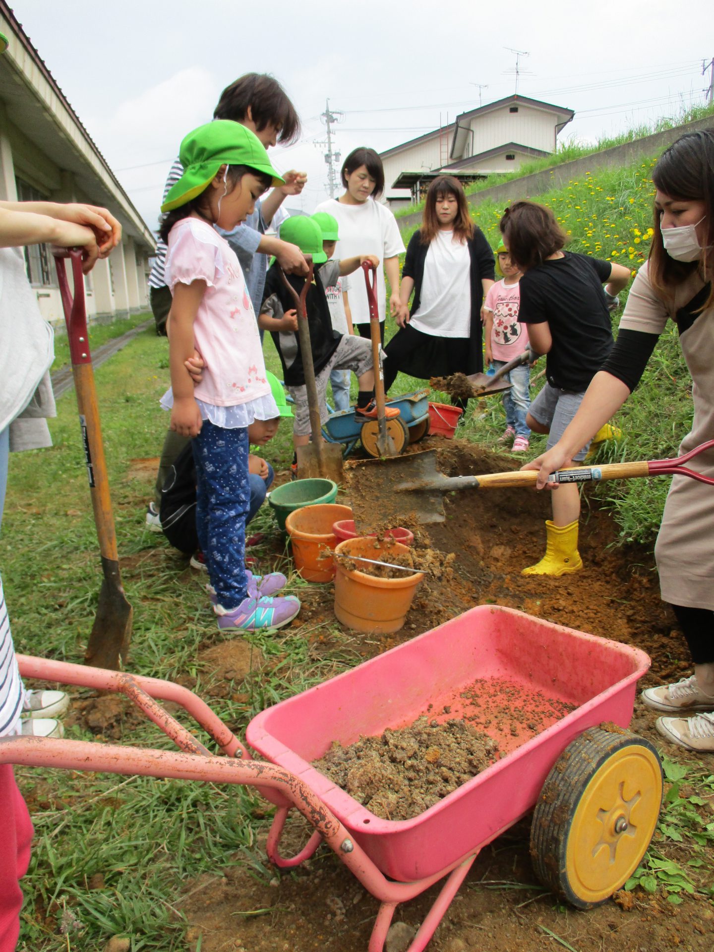 どんどん掘れていく土を掻き出して、二輪車やバケツに入れて別の場所へ運んで行きます。