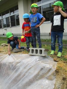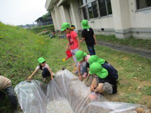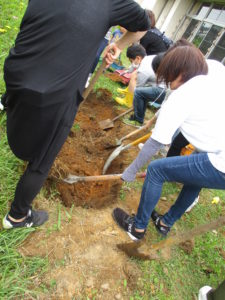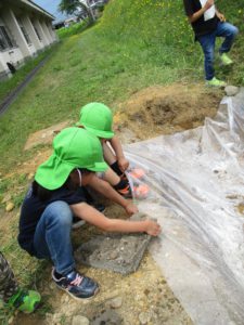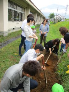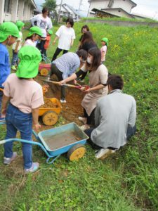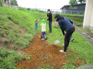 今回の活動で、子どもたちと一緒にスコップで掘っていたのですが、なかなか掘れず苦戦していました。クワとかで掘ったらどう?や、ツルハシで土を柔らかくしたらどう?ということを聞いて、私自身も思いつかなかったのでさすがお家の人たちはすごいな!と感じ勉強になりました。保護者の方も今までにいろんな経験をしてきたからこそ、あれはどう?これはどう?といろんな方法を見つけてやってみるということができるんですよね。子どもたちにもいろんな経験を経ていろんな道具を使って挑戦し、試行錯誤を繰り返しながら大きな困難にも一回やってダメでも諦めず次への方法を見出す力をつけて欲しいと思います。
