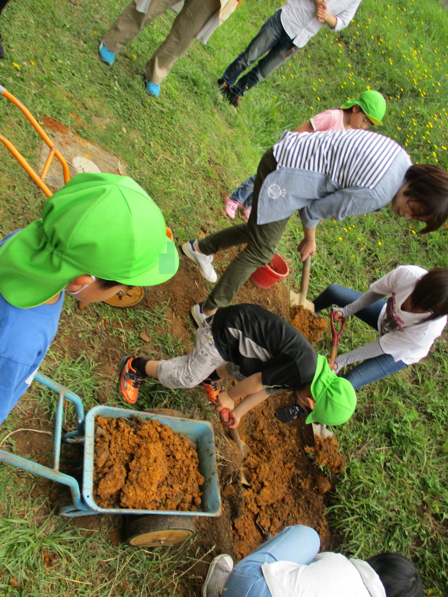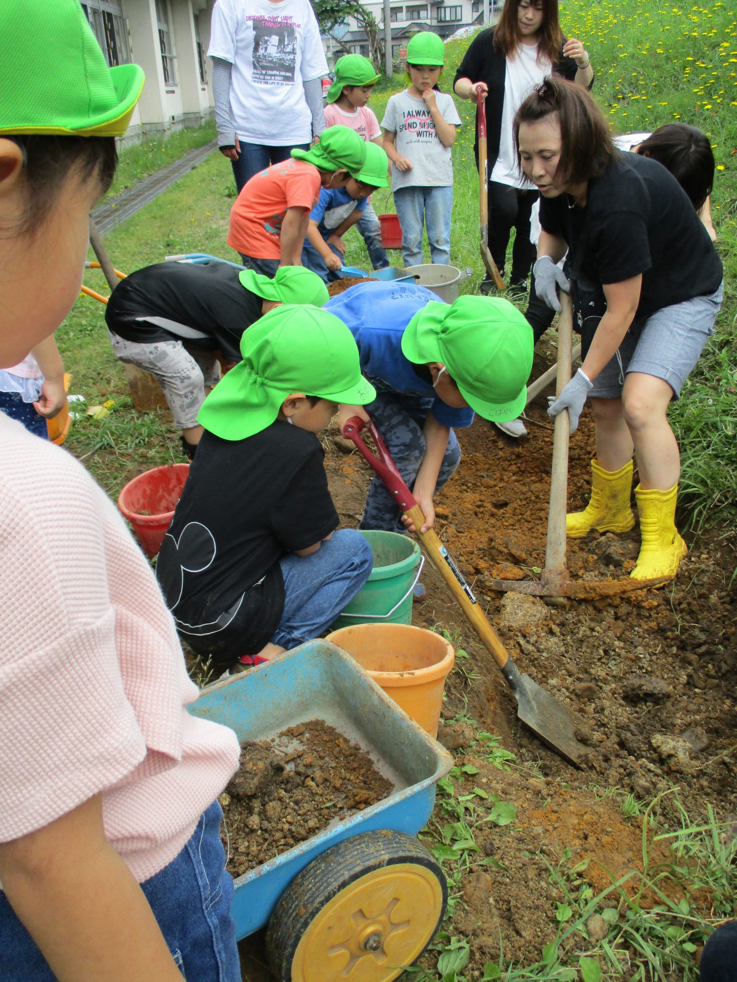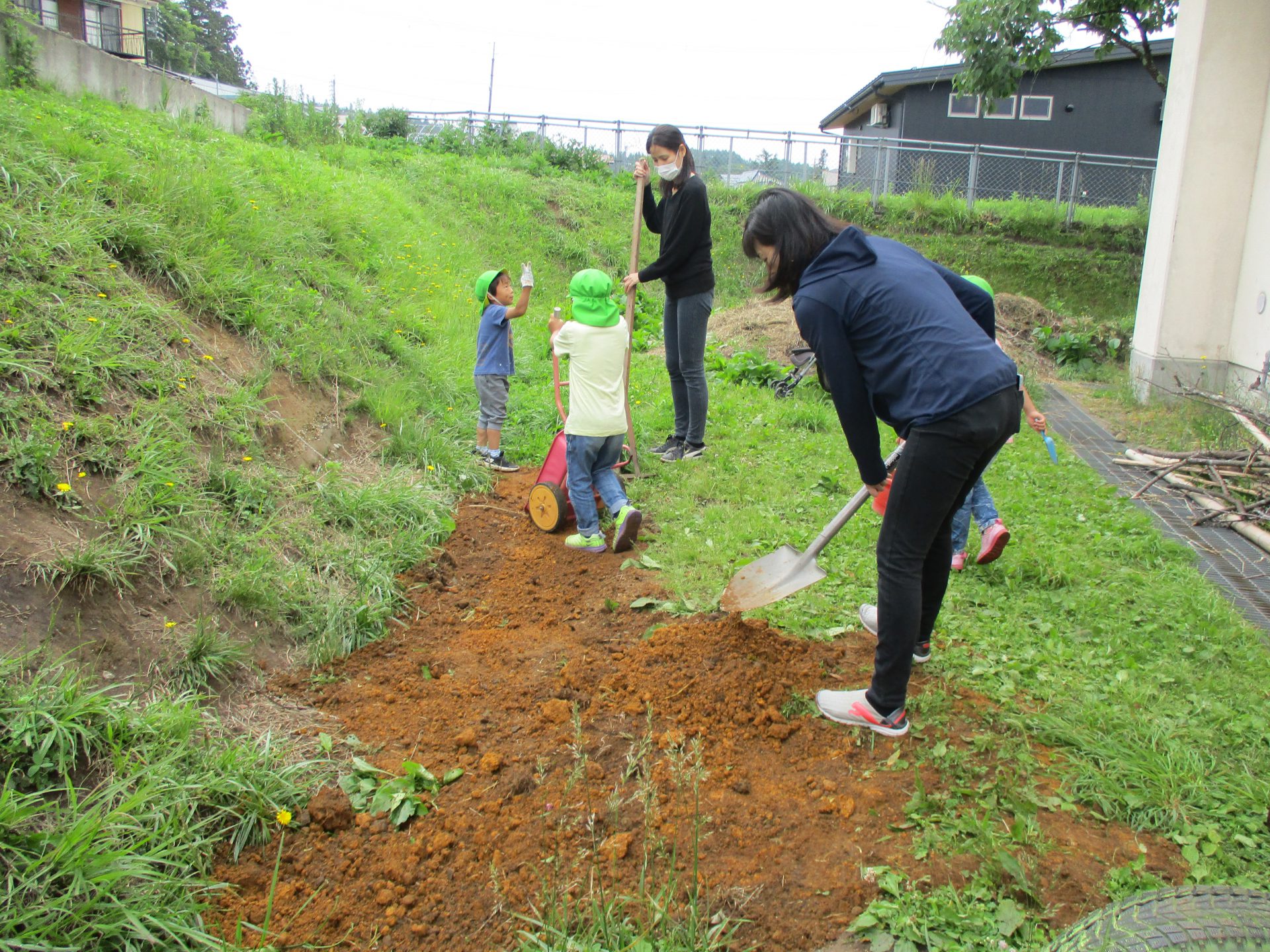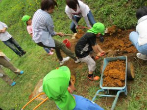 ここでもお母さんたちが活躍してくれました。運んできた土を均していただきました。