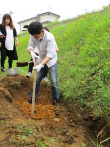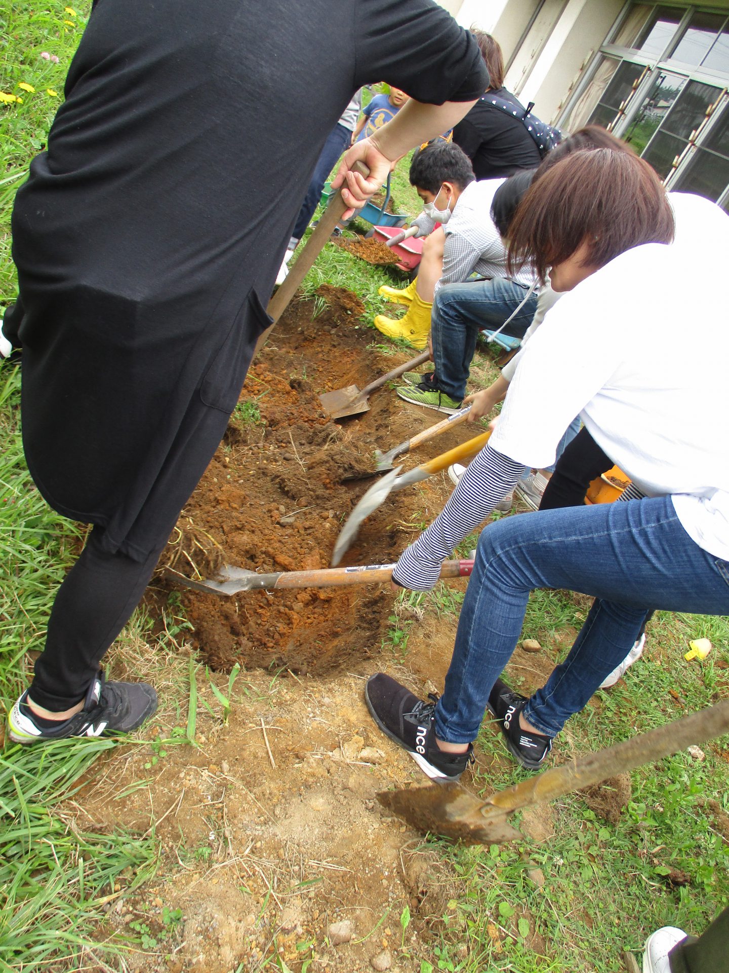 子どもたちがスコップを用意して、力のありそうな保護者に「お願いします!」とスコップを渡された保護者の方は掘り始めていただいたのですが、粘土質のためなかなか思うようにいきません、、