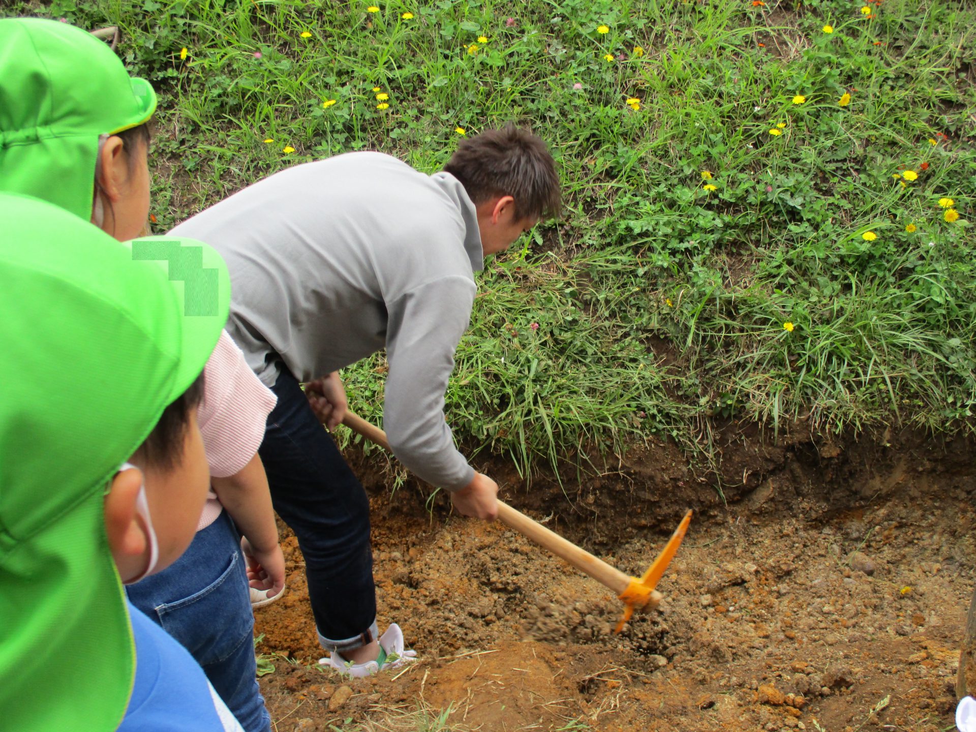 あります!とこの日はお父さん2人も参加して頂いていたので、ツルハシを渡すと、、