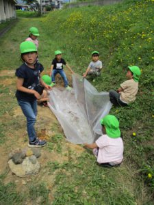 年長児では保育参観にお家の人たちと一緒にわくわく広場の池作りをしました。