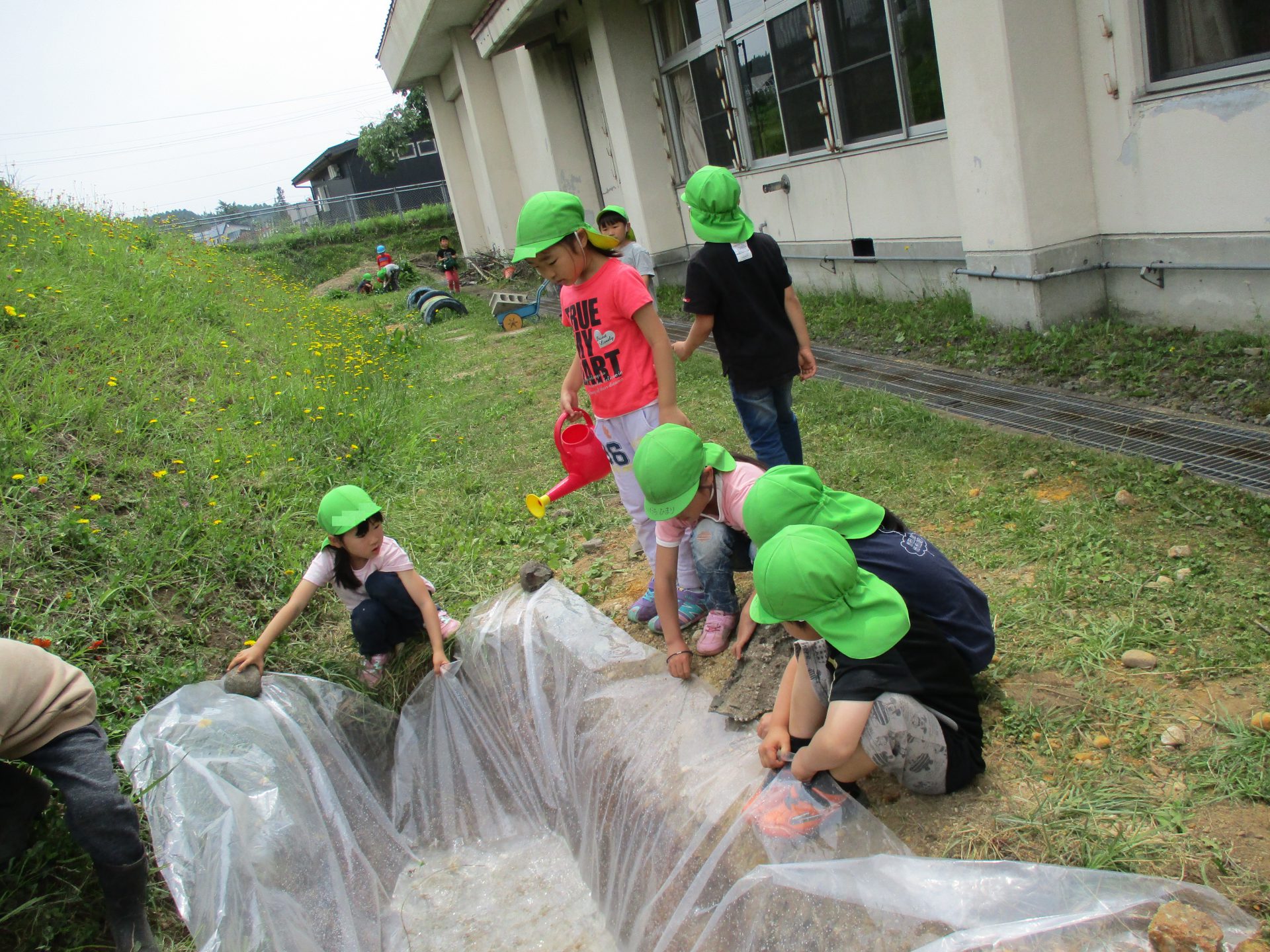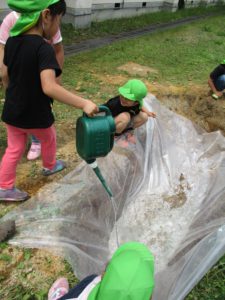 後日、お家の人たちと一緒に作った池にビニールを貼り、水を入れてみました。