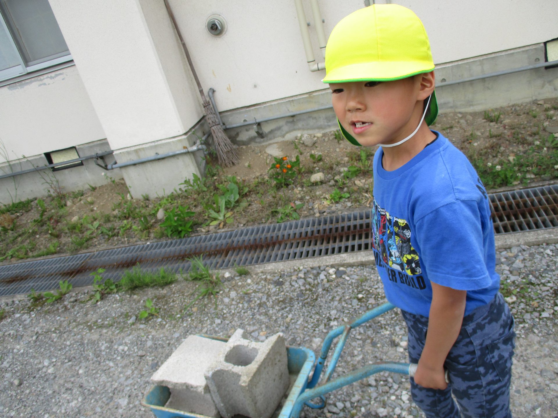 石を運んでいる際、大きなブロック塀を見つけると「これなら使えそうな大きさだ!」