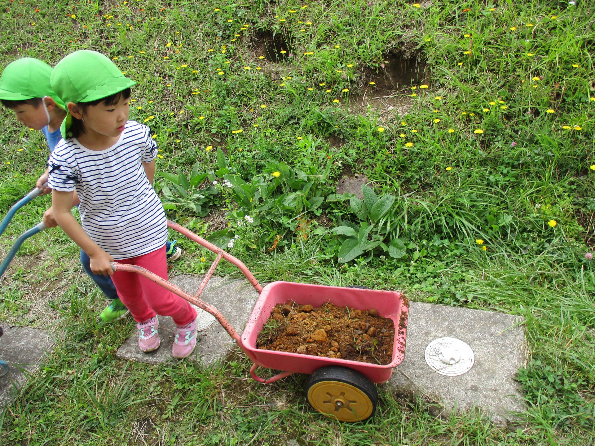 運んだ先は、土手登りの下のところ。子どもたちみんな大好きな場所なのですが遊んでいると土が掘れてしまい少しくぼみができていました。なので、掘り出した土はくぼんだ所や穴があいていた所に使いました。