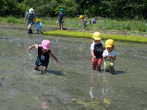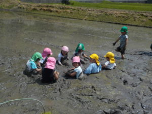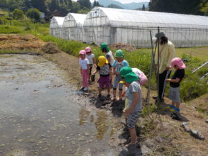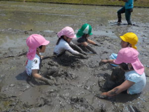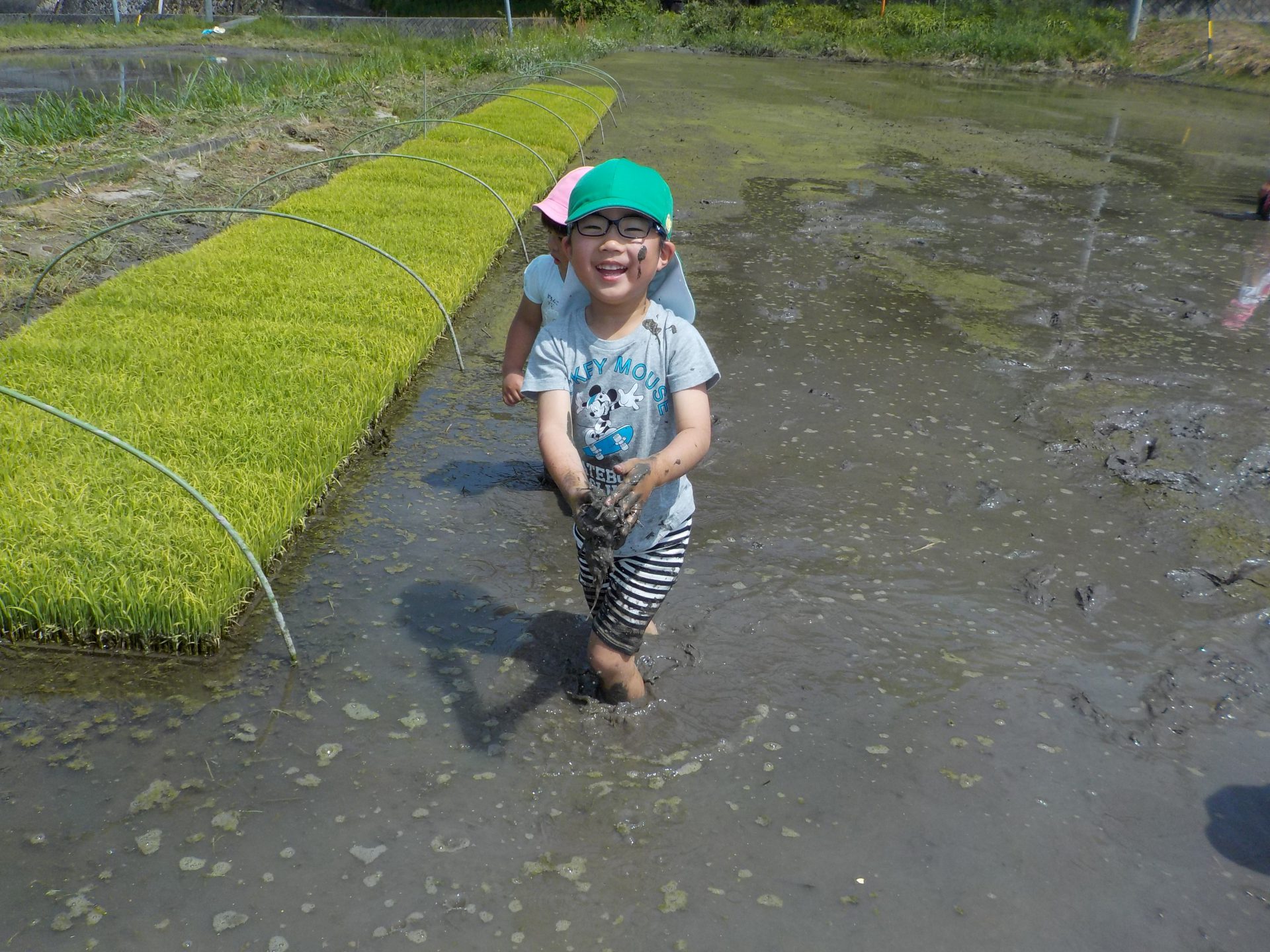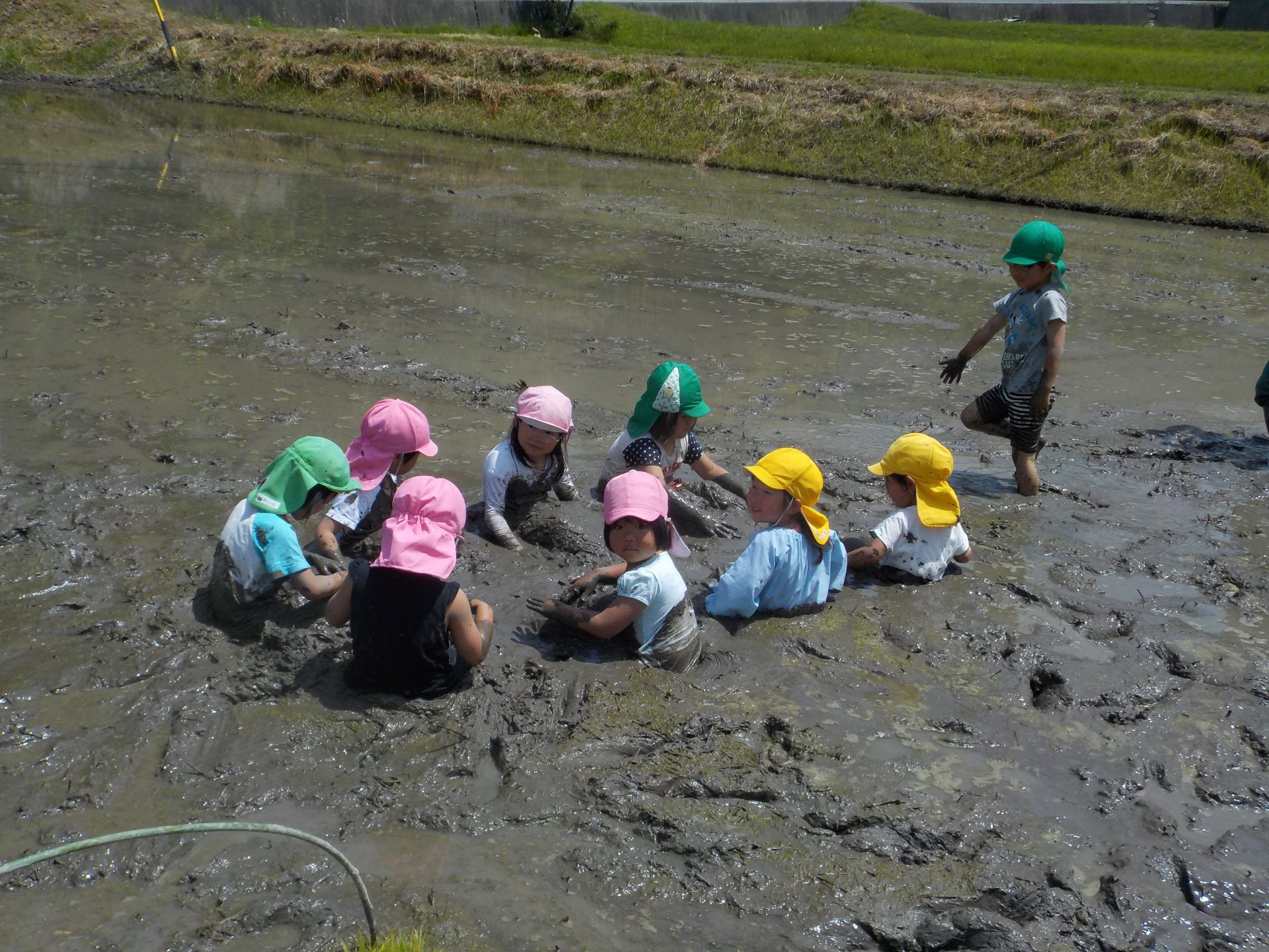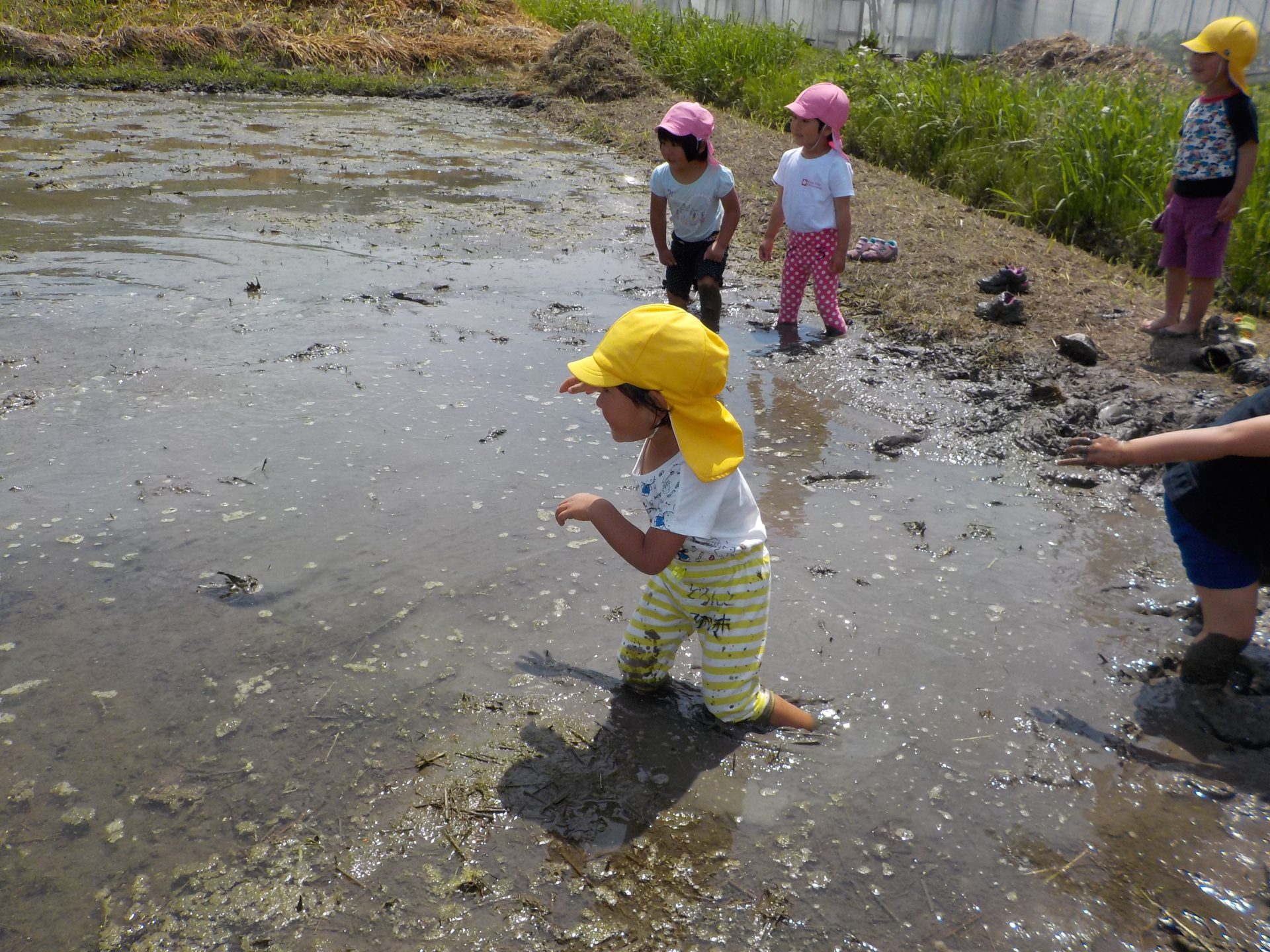 保護者の方から「お田植前に田んぼに遊びにおいなんよ~」と誘っていただいたので、泥んこパンツと服に着替えてみんなで遊びにいきました。はじめは、田んぼのふちに足を入れて「ヌルヌルするな~」「深いかな~」と慎重な子どもたちでした。