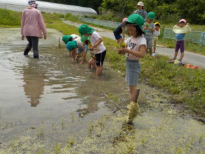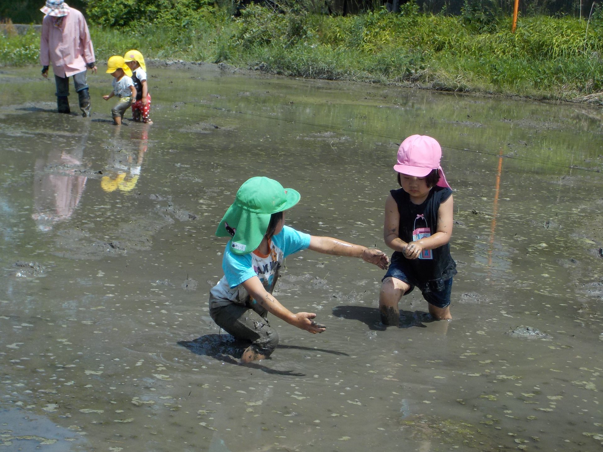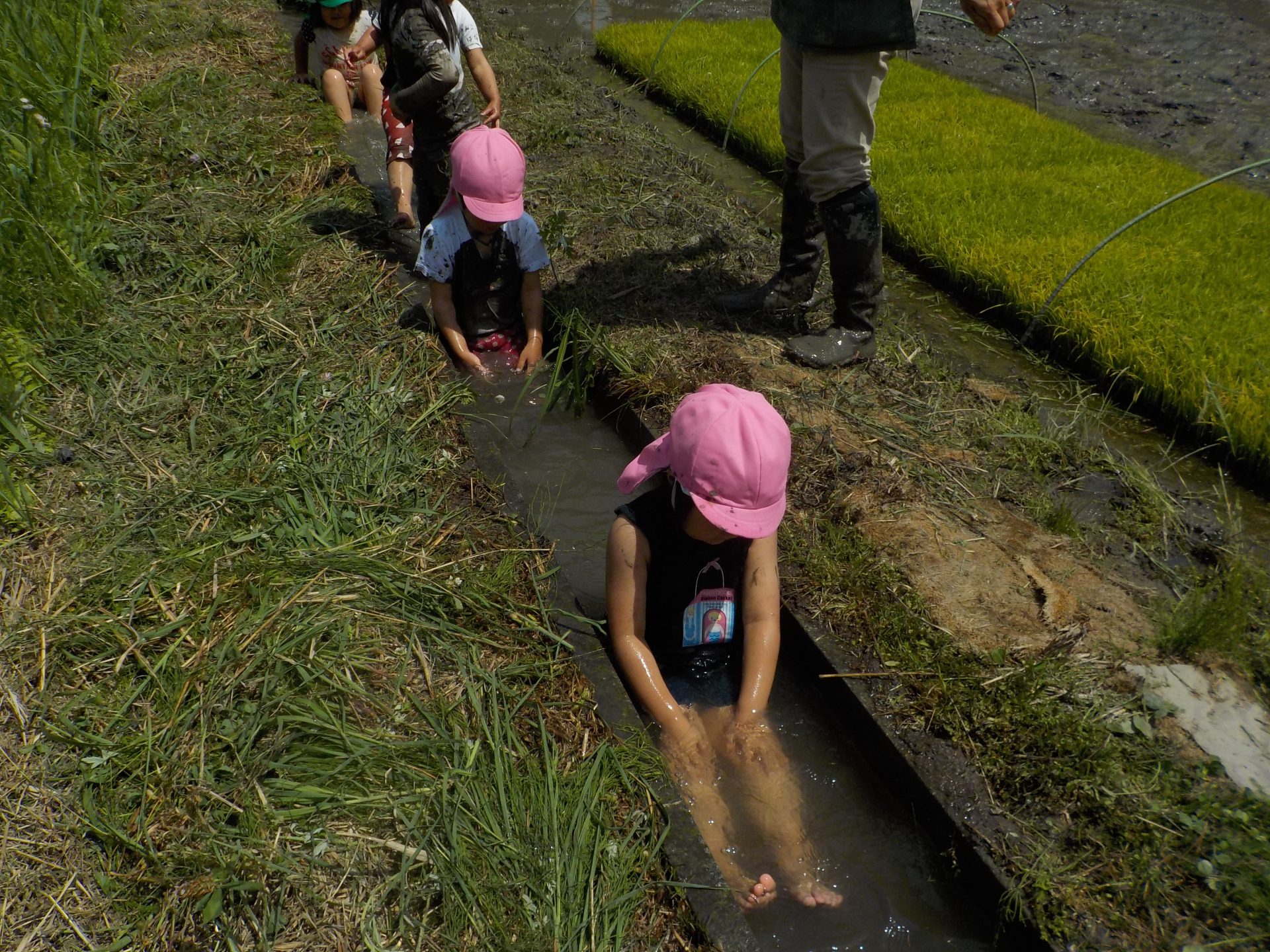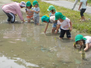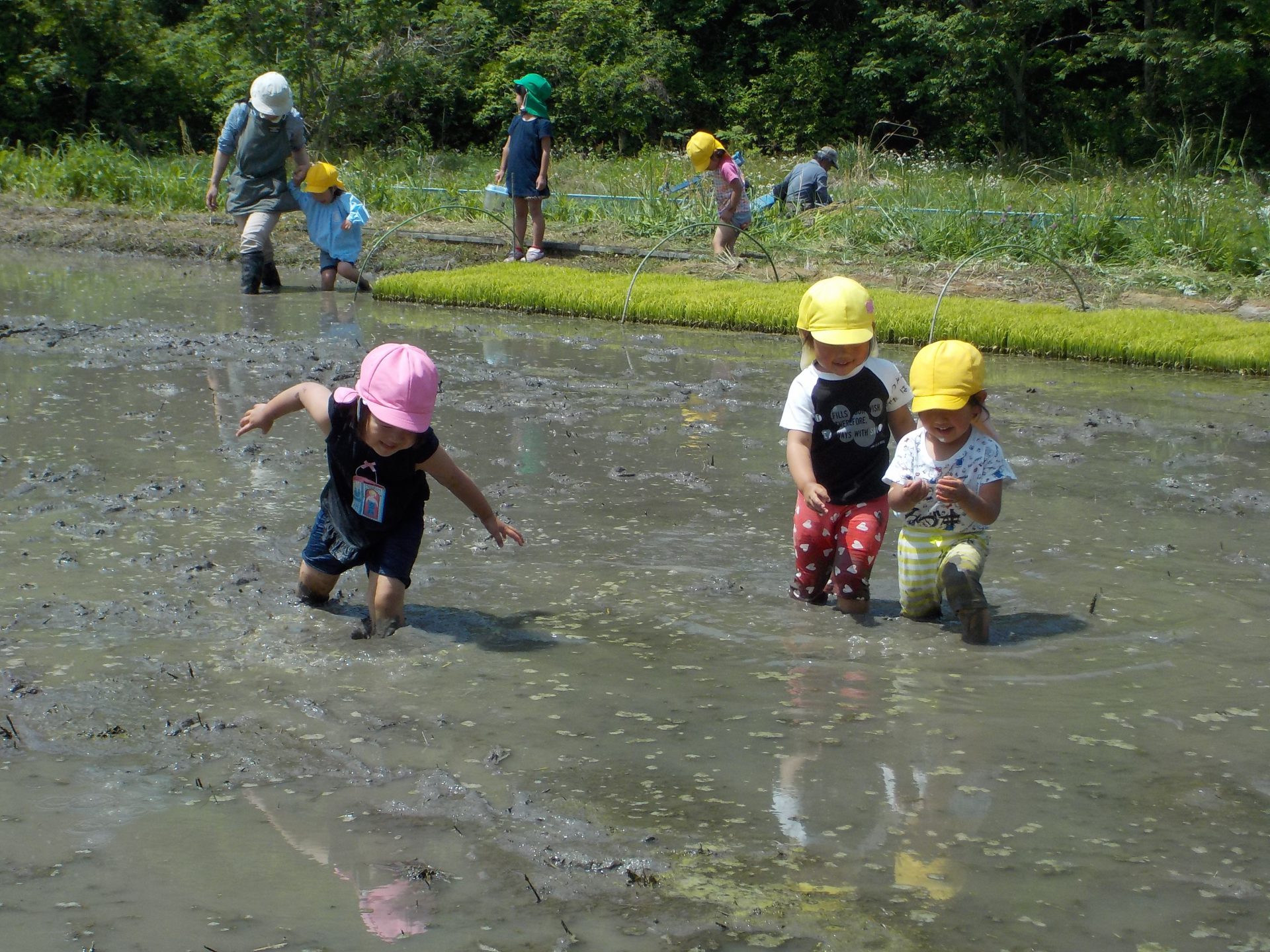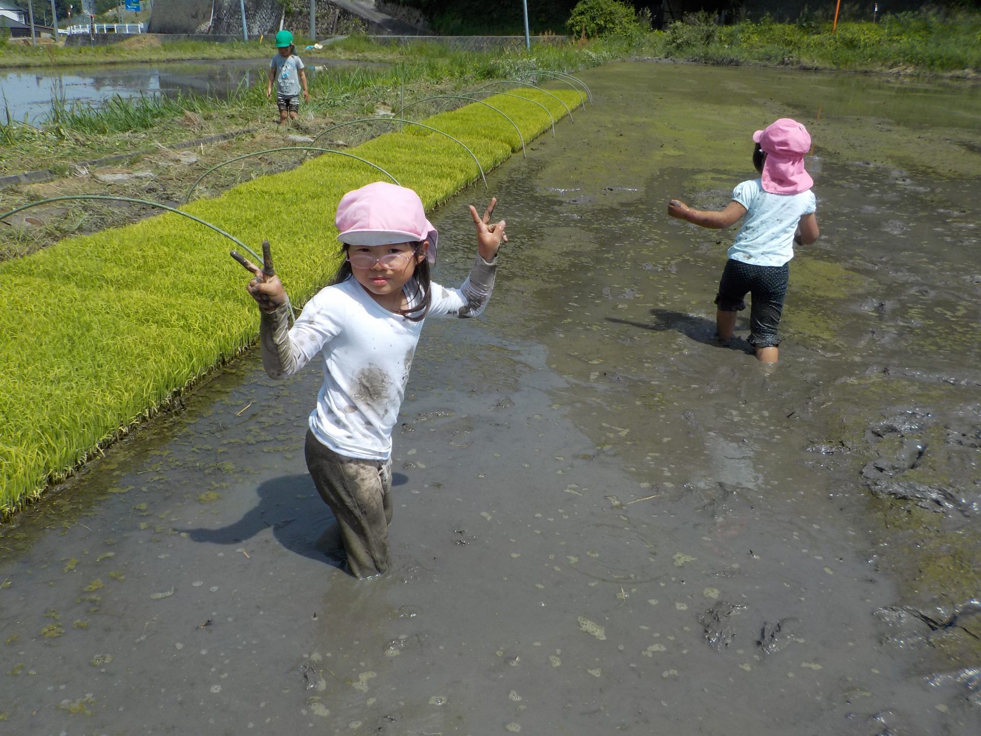 保護者の方から「お田植前に田んぼに遊びにおいなんよ~」と誘っていただいたので、泥んこパンツと服に着替えてみんなで遊びにいきました。はじめは、田んぼのふちに足を入れて「ヌルヌルするな~」「深いかな~」と慎重な子どもたちでした。