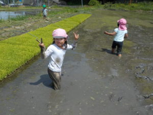 なかなか良い腰つきです。「難しいな~。泥の中に上手に立たないよ」「あ~腰が痛い。お米作りって大変なんだね」