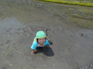 だんだんみんな集まってきました。「温かいね~。」「温泉みたい」「昨日、温泉行ったよう」「砂場の泥んこと違うね」「砂場の泥はザラザラしてるけど、田んぼの泥はヌルヌルしてる」